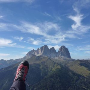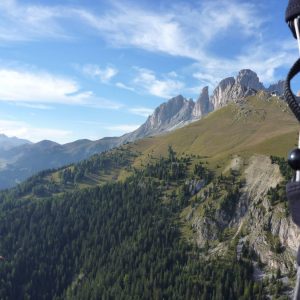 Nekaj po 13h se tudi mi spravimo na S stran za kočo, kjer piha gor, tako da se odločimo startati kar tukaj. Mega in Erzo in jaz postavimo, Faaca in Igor se še obotavljata, ko Mega odleti. Sprva je še kar obetavno, ko pa nad sedlom zavije v levo, dobi po dolini za Col Rodello takšen veter od spredaj, da ga gunca in zaustavlja, da se še King komaj prebija naprej.