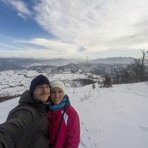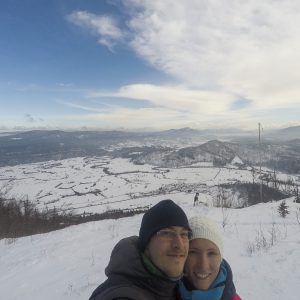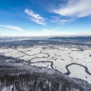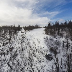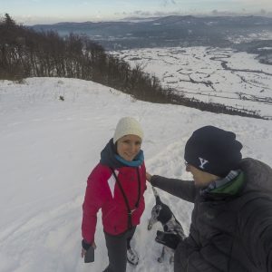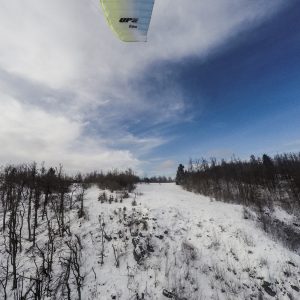 Parkiram ob vodnem hramu ob cesti in v mraz (-5 st). Vetra nula (kar je tukaj redko, običajno piha s strani ali od zadaj…), zato hitro postavim Rooka pod pastirjem na poprhan travnik. Vreme je zelo megličasto neprijazno (ne morem reči sluzasto, ker je vse trdo in zamrznjeno in pošteno suh sneg), se pa vidi dol do Razorske.
