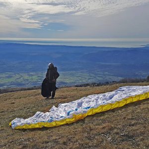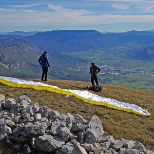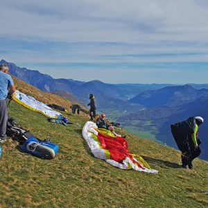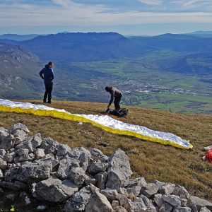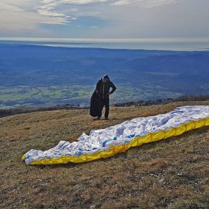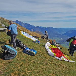 Na startu kopica zmajarjev in ekipa Valičev s Fedelko, ki ravno preštimavajo štrikce na Knightu. Piha enakomerno močno (4-5/7), medlo sonce sije skozi pokrito nebo, inverzija močna, vendar se dolina za silo vidi. Takoj postaviva in v luft: Zoran in Igor.