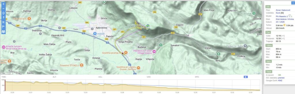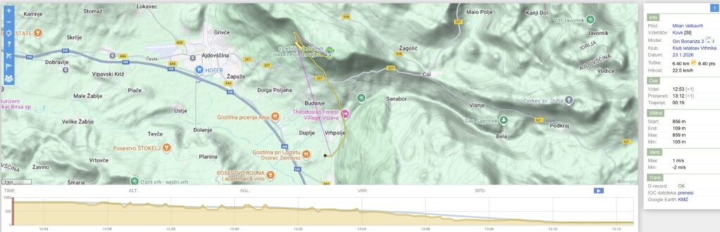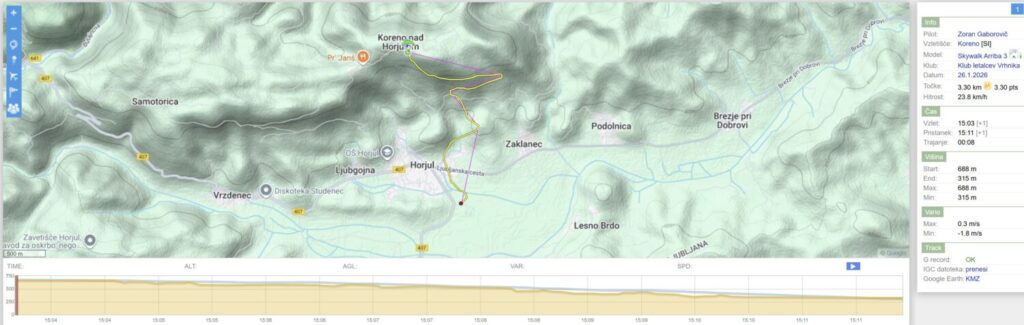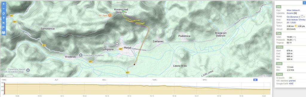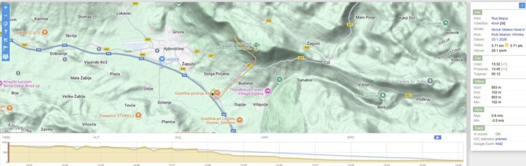 Po dveh močno deževnih dnevih danes izboljšanje. Vetra nikjer nič kaj dosti in vsaka napoved kaže svojo sliko (smer vetrov in jakosti in …). Zaradi zemeljskih obveznosti sem šele ob 13.20 na Vrhniki s ciljem na Kovk, saj sta Mojca in Milanče ugotovila, da tam bo.