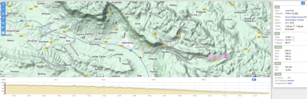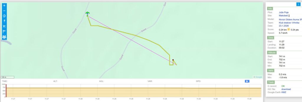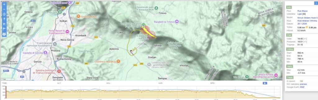 Potegnem prvi (hvala Milče za sekundiranje) in skozi rahle meglice zapeljem na levo ob pobočje. V rahlo termičnem kar držim višino proti Slevici in naprej. Obrnem nazaj … in potem kmalu pristanem pri ŠPH.