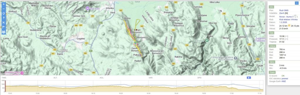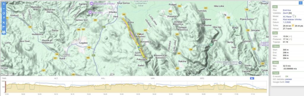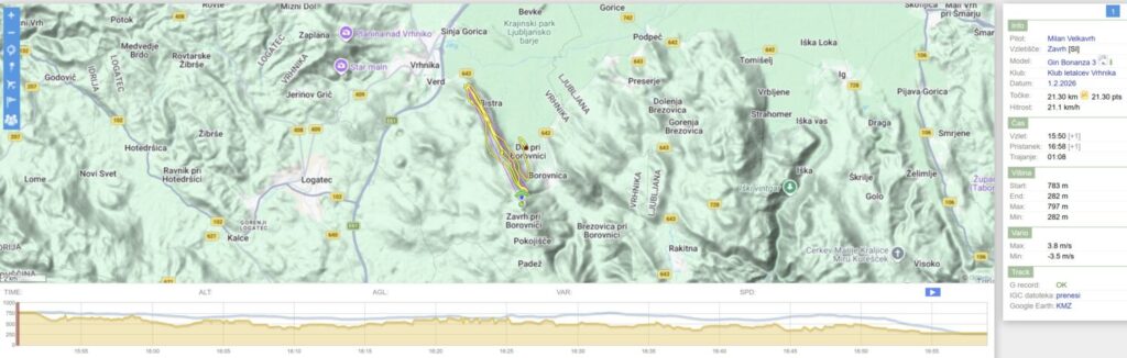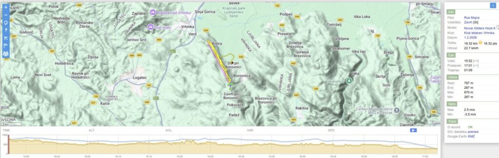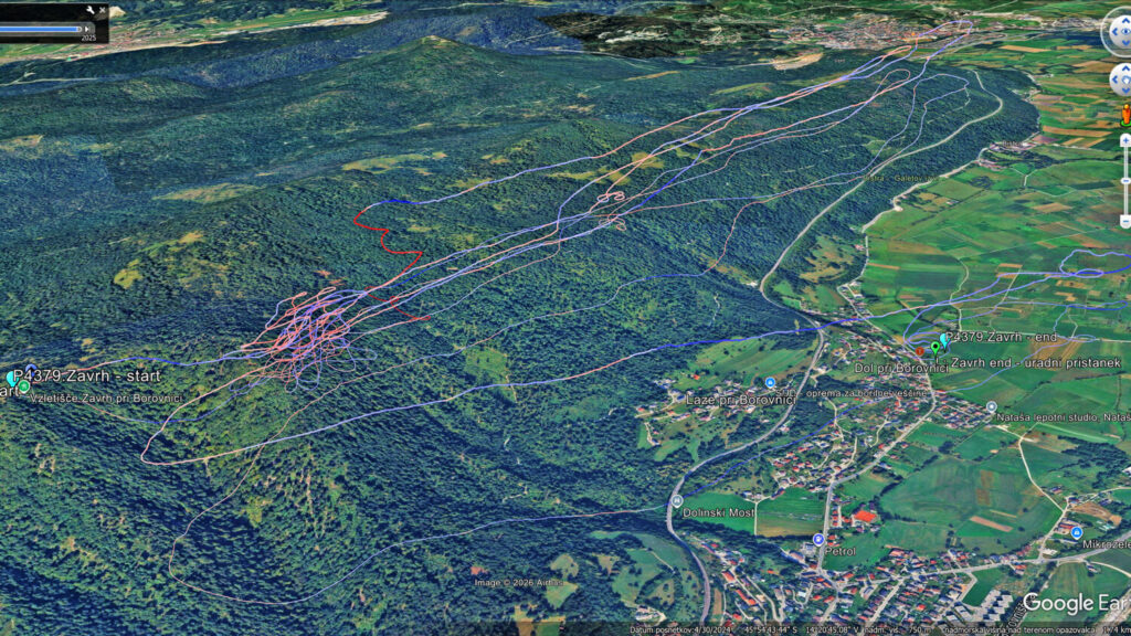 Nazaj kar dviguje, Mojca pobere bolj zunaj nad Dolom, jaz pa tam nekje dobim dviganje dneva, ki me skoraj po liftu dvigne za 200m. Veter je tu gori (na 900+) močnejši in naprej samo še vozim v vzdrževanju višine bolj zunaj do Javorča. Sedaj sem tu precej višji kot prvo rundo in nazaj zapeljem z bogato višino bolj nad dolino.