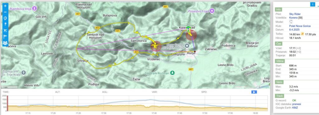 Jože Poje : Eden najboljših letalnih dni. Lepa dviganja. Malo vetra. In od Ulovke naprej samo letenje, ker me čas lovi. Ni časa do Horjua, kar proti Brezovici. [8.4.2025 15:34]