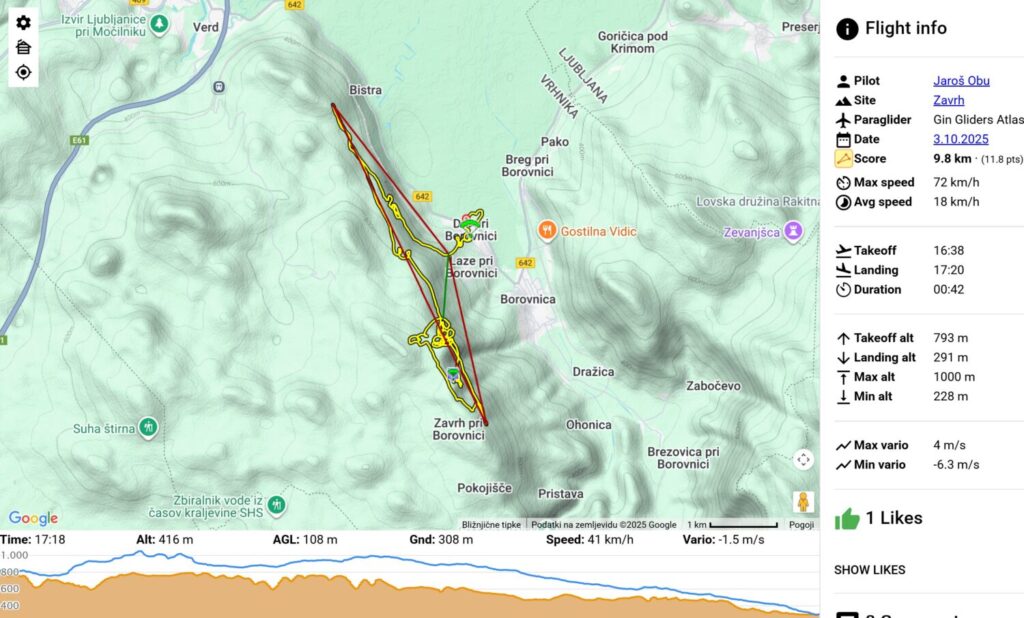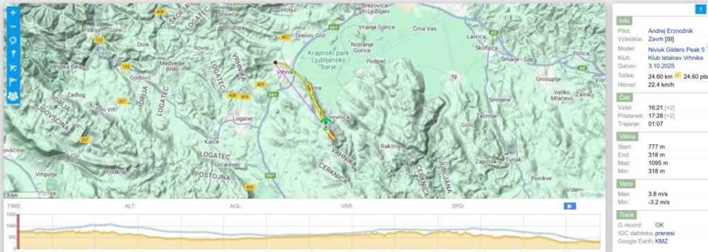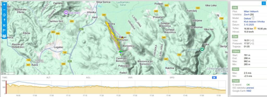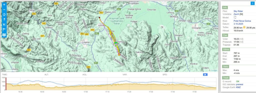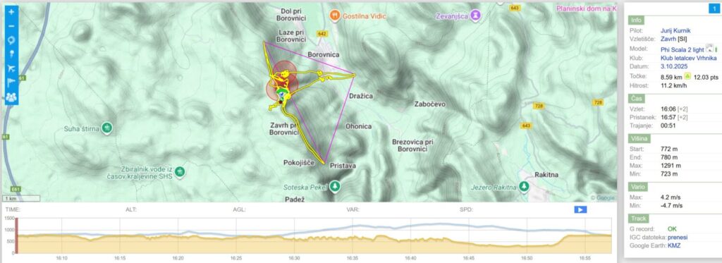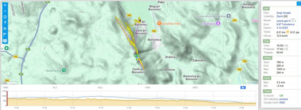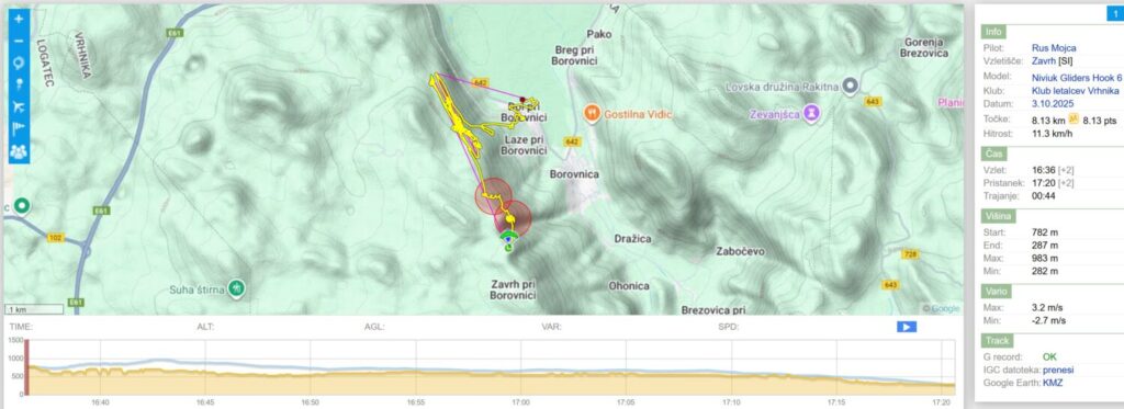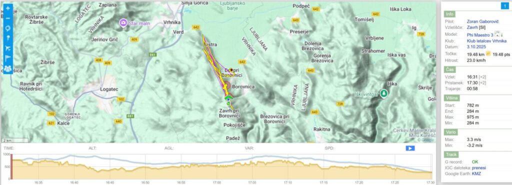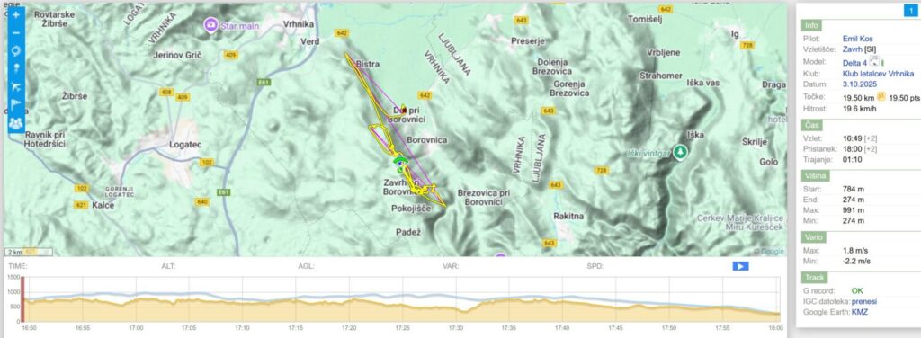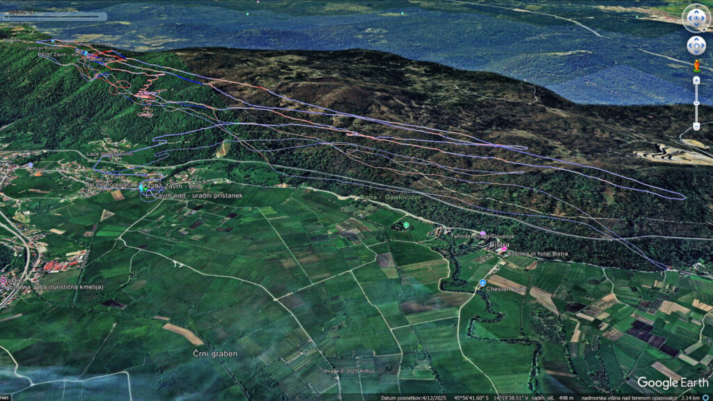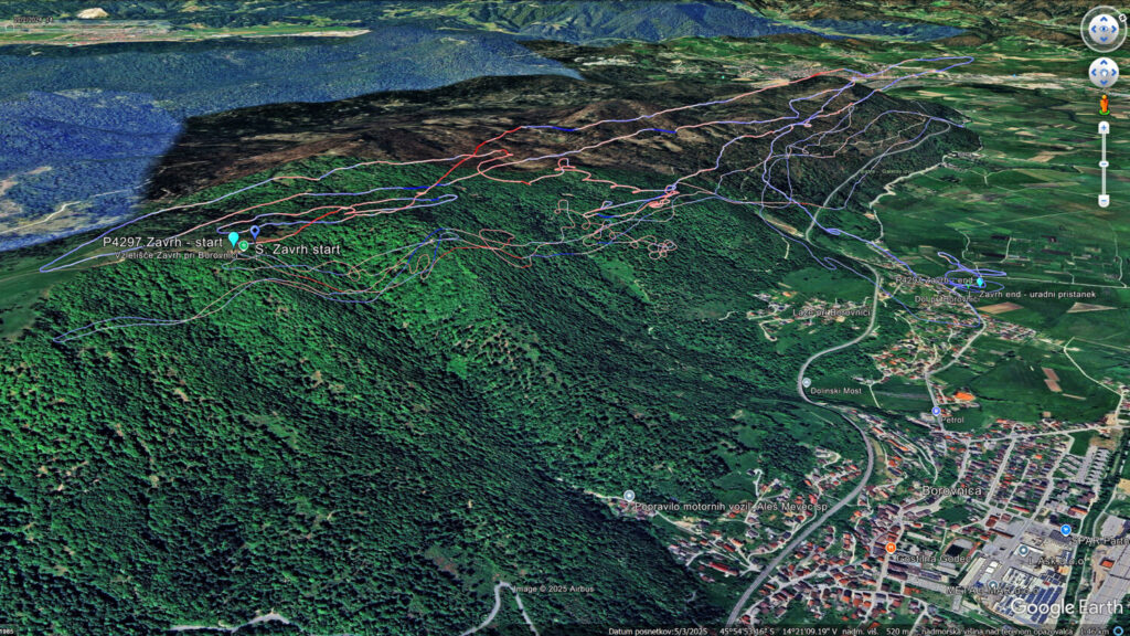 Pred startom v kotlu je veliko vetra, ki z višino narašča, tako da sem kmalu nad grebenom okoli 1000. Občasno kar zagunca in se držim bolj zunaj. Tudi ostali so razsuti po nebu naokoli, eni nižje, drugi visoko nad mano. Kar bolj zunaj pred grebenom do Javorča. Ker vidim Erza in Igorja kako se nizka vračata po polžje izza Javorča, obrnem kar pred njim (Delux še vleče naprej, kar ga na povratku tudi stane višine in precej upočasni) in bolj zunaj zapeljem tudi nazaj. Se mi zdi, da malo bolj stran od pobočja bolje drži in dviguje, saj brez vrtenja dohitim Erza in Igorja (ko vrtita nad Dolom), tu malo naberem, da me potem proti Trebelniku spet odlifta čez greben in mimo starta (spet okoli 1000) do Antene.