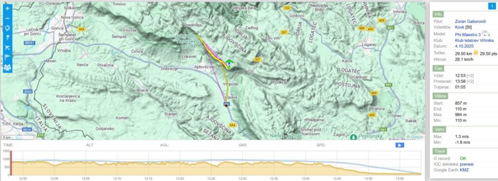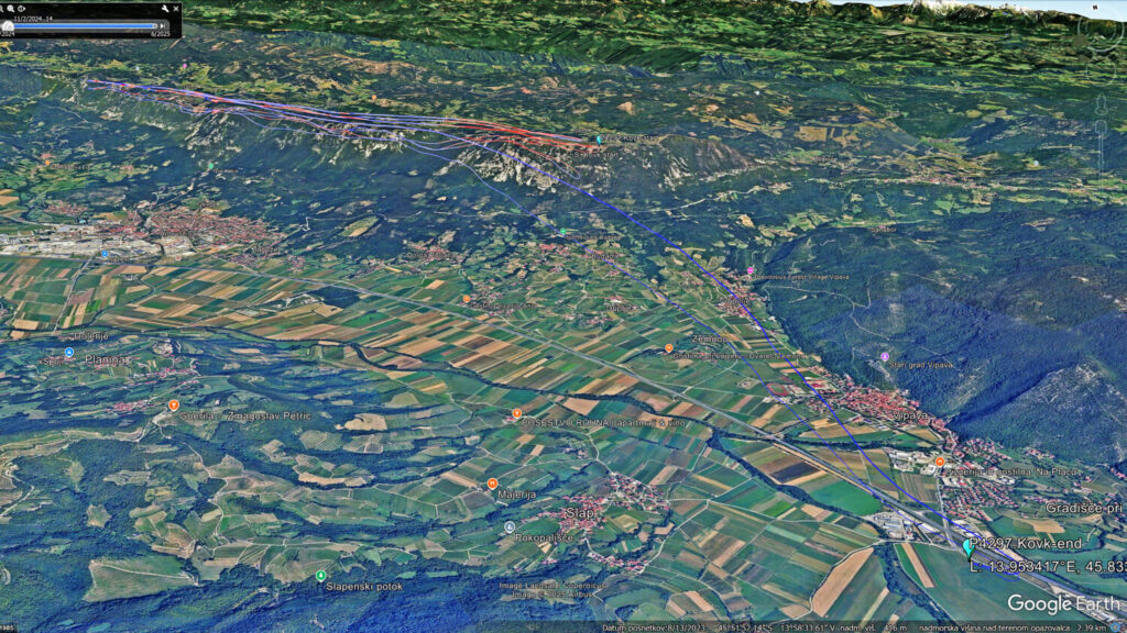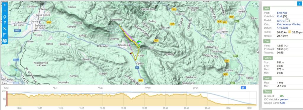 Ko sem že mimo Hublja spet proti Otlici, (spet vse brez pobiranja), pa začutim prve kaplje (dež sicer danes niti pod razno ni bil napovedan po nobenem modelu…). Obrnem in vozim po vedno hujšem kapljanju nazaj mimo Hublja. Kmalu že lepo škreblja po padalu, očala pa vsa mokra. Nekaj ljudi je še v luftu, vendar večina beži ven in ekspresno proti pristanku. Tudi sam peljem kar ven na odprto mimo Podrte proti Vipavi, saj se mi tam zdi malo bolj čisto. Res kapljanje poneha nekje pred Vipavo in potem vlečem, dokler gre.