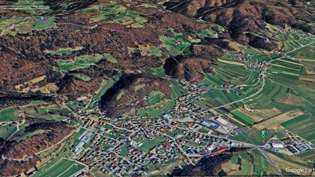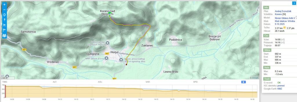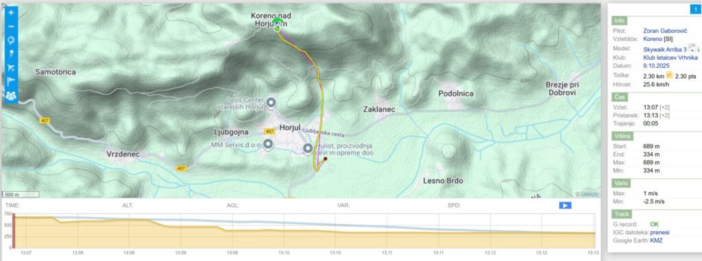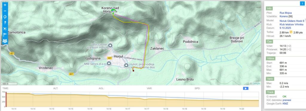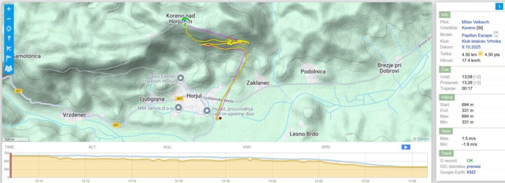 Sprva je kar termično (zgoraj S, spodaj termika), ko zapeljem stran od hriba, pa samo še z vetrom v hrbet do Škorpijona.