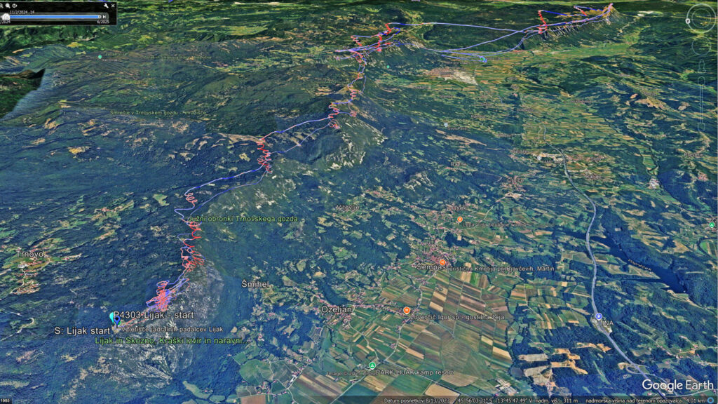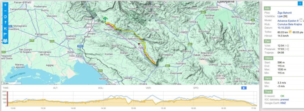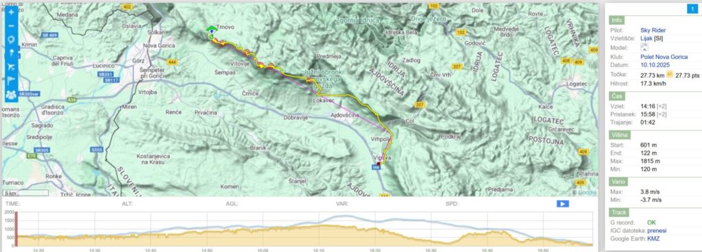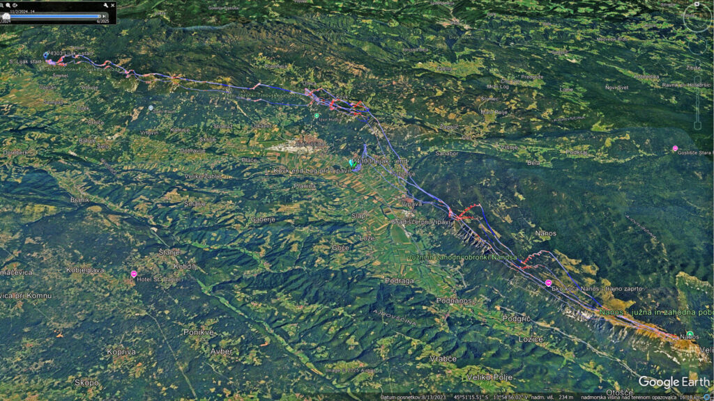 Počasi in nizek končno pririnem na Hubelj, obrnem malo naprej in spet na Podrto, kjer naberem do baze malo pod 1500. Kar ven čez Budanje in Vipavo visok, da pred Plazom spet zacurim in s 700 priklopim pobočje Nanosa. Tokrat lepo speljem do Gradiške Ture, kjer naberem spet do baze malo pod 1500. Po izgubljeni višini pri Lovski še enkrat poberem do baze v zanosu nazaj nad planoto, da potem brez težav zapeljem do Antene, kjer obrnem (če grem naprej, me bo samo splaknilo čez Razdrto kvečejmu do Hruševja, si mislim, čeprav se potem izkaže, da je Erzo z višino nekaj čez 1500 prišel skoraj do Postojne…).
