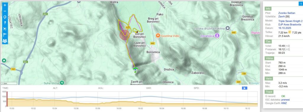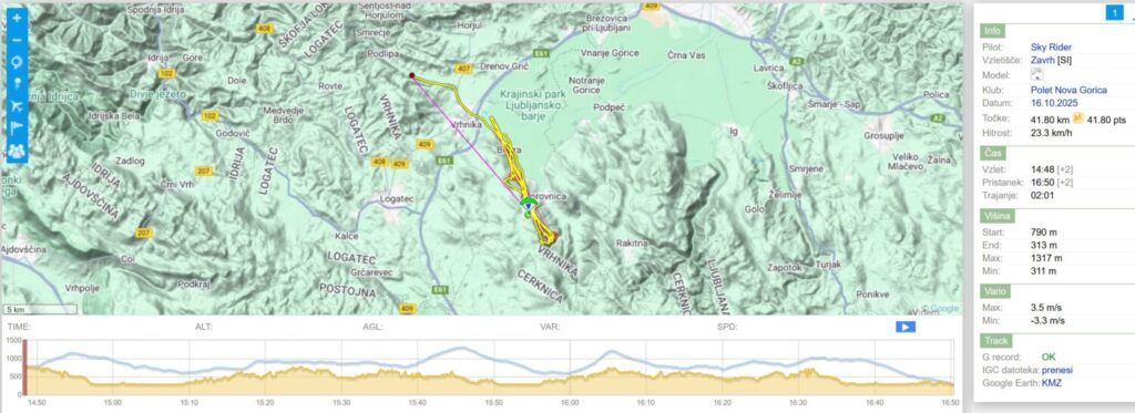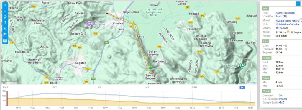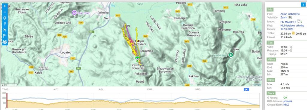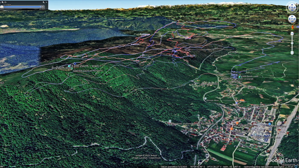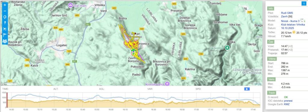 Drugi obrnejo bolj ali manj pozno in temu primerno nizko rinejo nazaj. Sam obrnem na Javorču in se bolj zunaj vozim nazaj med 800 in 1000. V zraku se nam pridruži (poleg še nekaterih…) tudi Roman. Nad Dolom spet lepo naberem in potem potegnem do Antene (nekateri so tudi tu že daleč naprej).