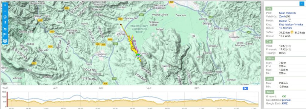Druga runda je malo bolj umirjena, vendar pa od Trebelnika naprej zacurim z -2.5, da že mislim, da sem na tleh, pa se nad Dolom spet rešim (kot včeraj) in uspešno naprej do Javorča in obrat. Nebo je malo manj temačno, pa še vedno pretežno pokrito.