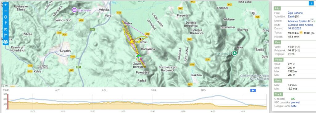 Nižji se vračam, da nad Dolom naberem na 1100 in še drugič (v zelo razgonjenem) od Trebelnika do Antene. Hladno je in po malem imam že zadosti, zato se v rahlem in konstantnem dviganju odpeljem direkt ven nad Barje, dokler me le ne začne spuščati. In nazaj na pristanek.