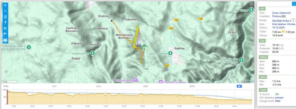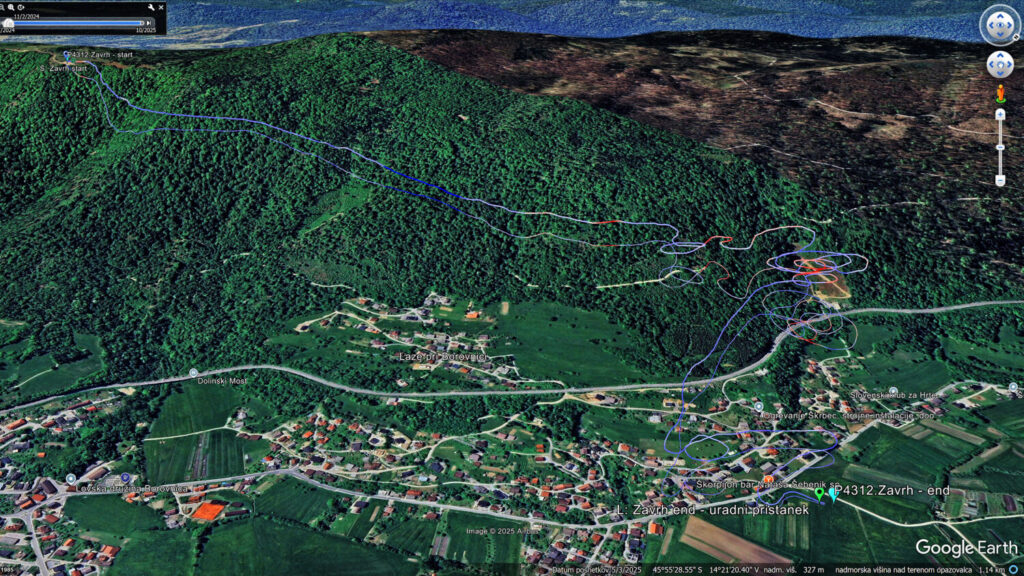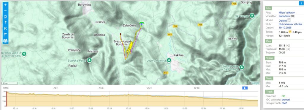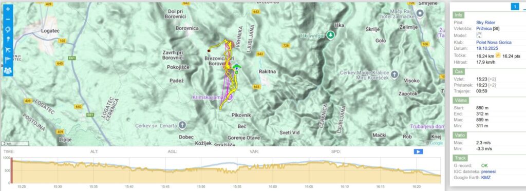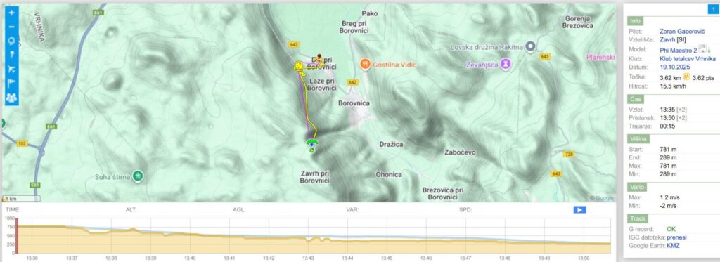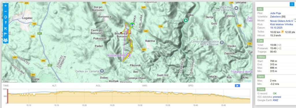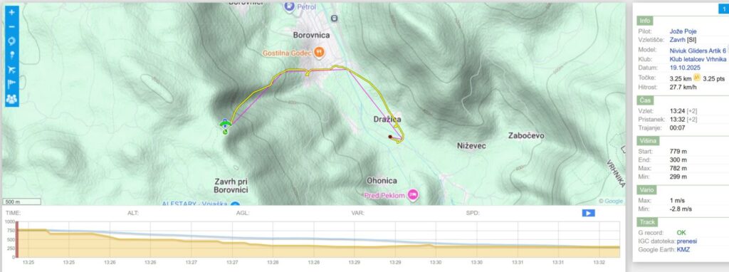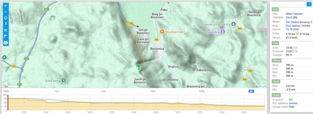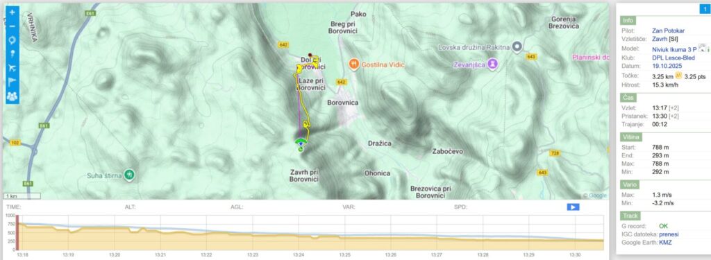 Naslednji odletim jaz, pridem okoli Trebelnika in šele nad Dolom dobim neko šibko piskanje in se matram… in scurim na pristanek.