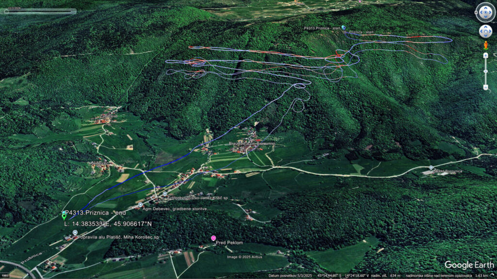 Na levo za Pojetom, v rahlem dviganju kar nekaj časa, preden se križava s Pojetom, ki se vrača nekaj m nižje. Kmalu tudi sam obrnem in mimo starta, kjer Boris ravno prekine prvi dvig. Potem pa v počasnem curjenju naprej v smeri Zabočeva, občasno tudi lepo piskne in dvigne in v glavnem kar drži. Še nazaj, pridobim nekaj m in okoli roba spet pod start Prižnica. Delux in Poje rineta kar naprej ob pobočju v notranjost doline.