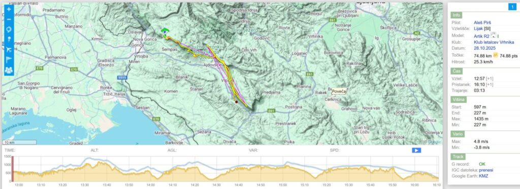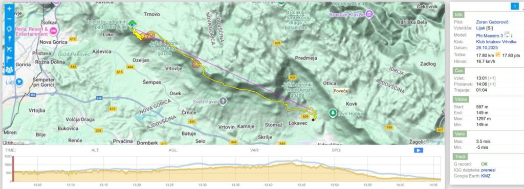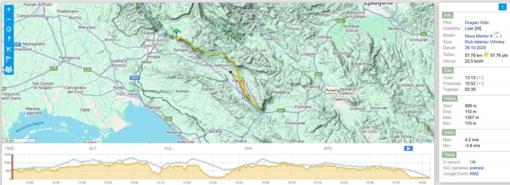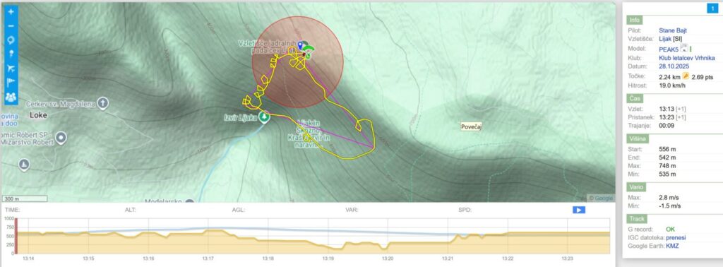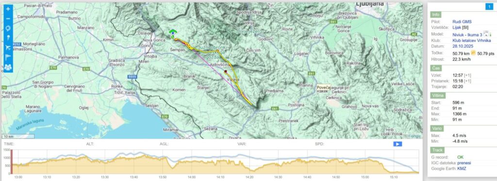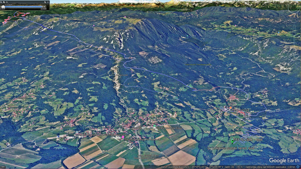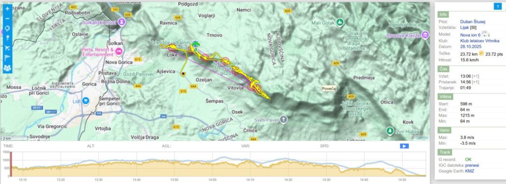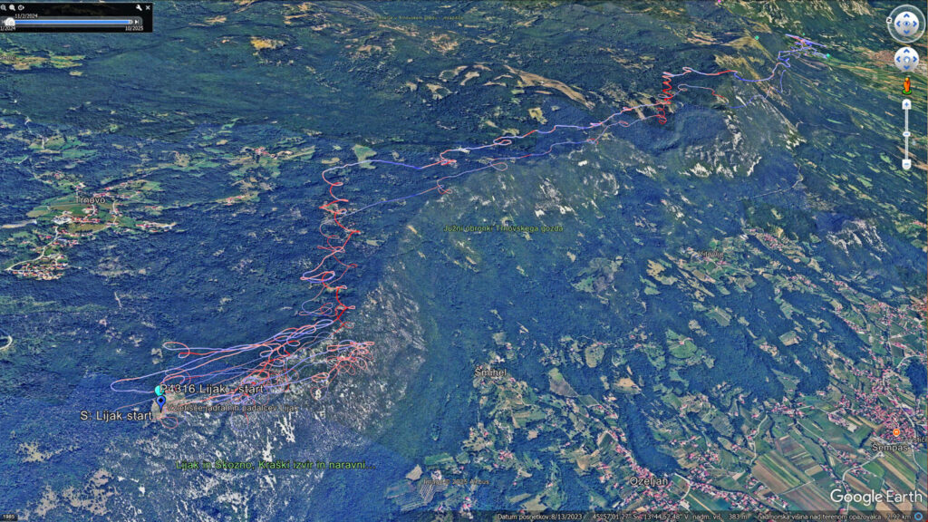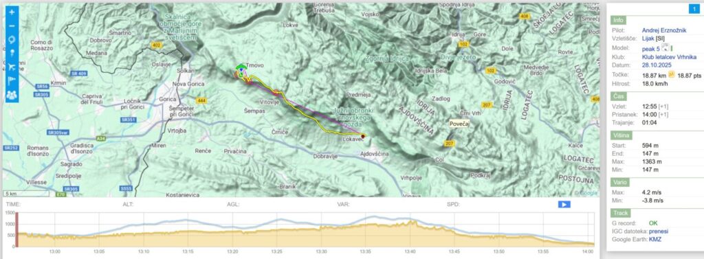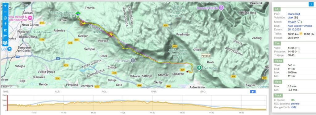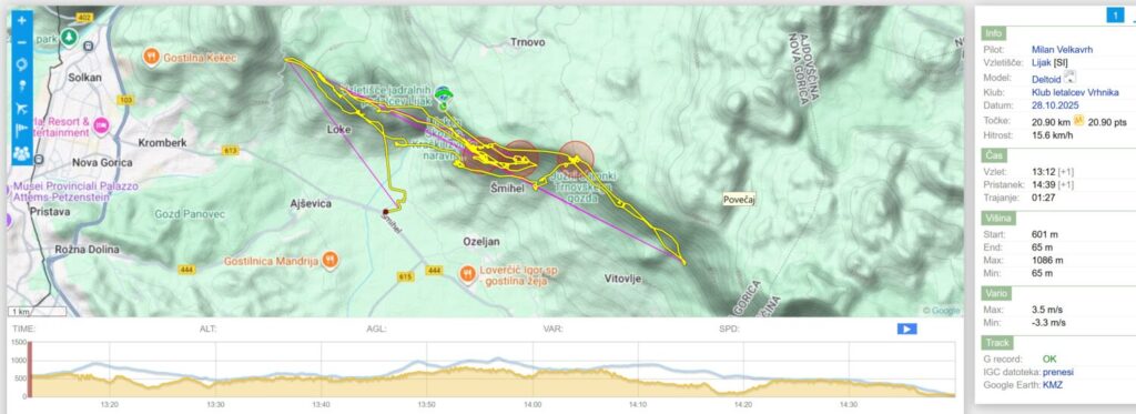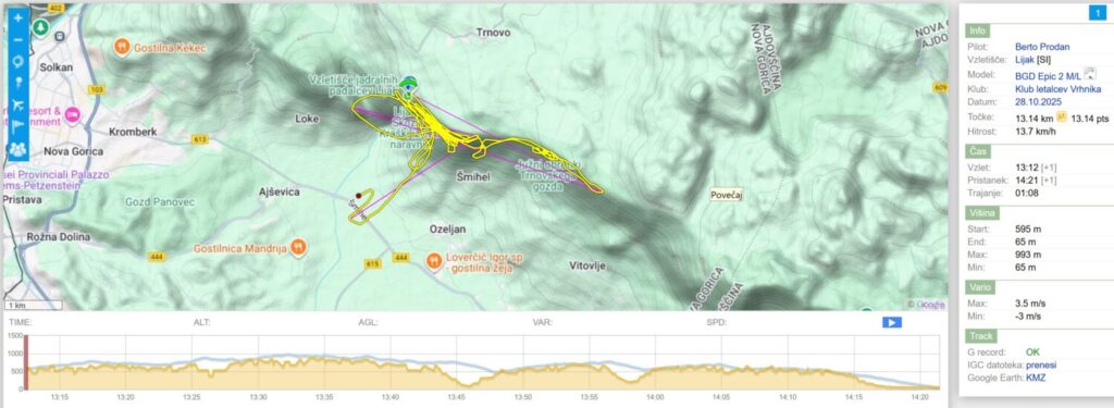 Ko enkrat le dobim dovolj višine, potegnem do Kasarne, nabiram in zgubljam, še nekaj v kotlu za Zmajarsko, potem pa na pobočju Čavna vztrajam, da bi dobil dovolj višine, da me ne bo razmetavalo pod grebenom Čavna, ko bom šel naprej. Res naberem na 1300 in se čez vrh odpeljem proti Kuclju. Pa me vseeno tudi v višini razmetava, zato zapeljem malo bolj ven, kjer pa me nekje okoli Kuclja splakne z -5 ob hitrosti 55 v nižave pod greben. Potem se samo še borim (tik ob pobočju ni nič – razen razmetavanja, tudi zunaj le curim tik nad spodnjimi gozdnimi platoji), da se na koncu vržem mimo vogala pod Modrasovcem čez proti pobočju Kovka, kjer pa sem že dosti prenizek, da bi se lahko rešil. Nekaj časa pa še držim višino nad šolskim terenom Lokavec in opazujem Erza, ki še nižji pristaja.