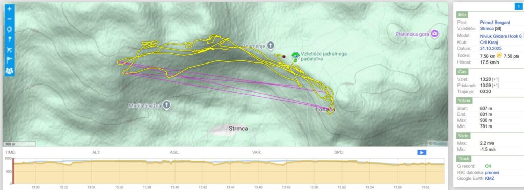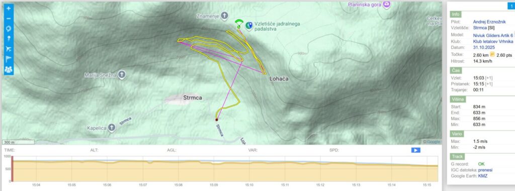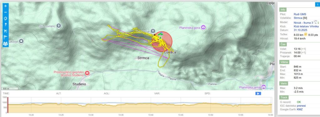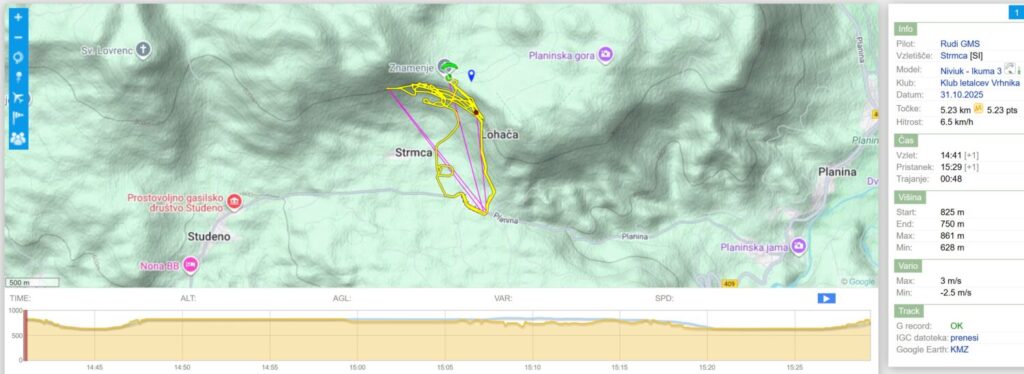 Med vožnjo gor po LCja pokliče Erzo, da gre na Strmco, kjer že jadrajo Jean, GMS in Bergant. Ker postaja tam kaže zmerno jakost (cca 6/7 JZ) in Jean iz zraka pove, da je baza v višini okoliških vrhov, se odločiva tudi midva za tja.