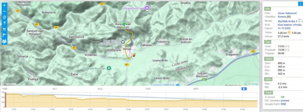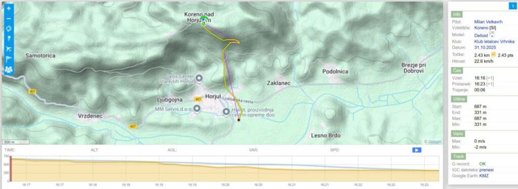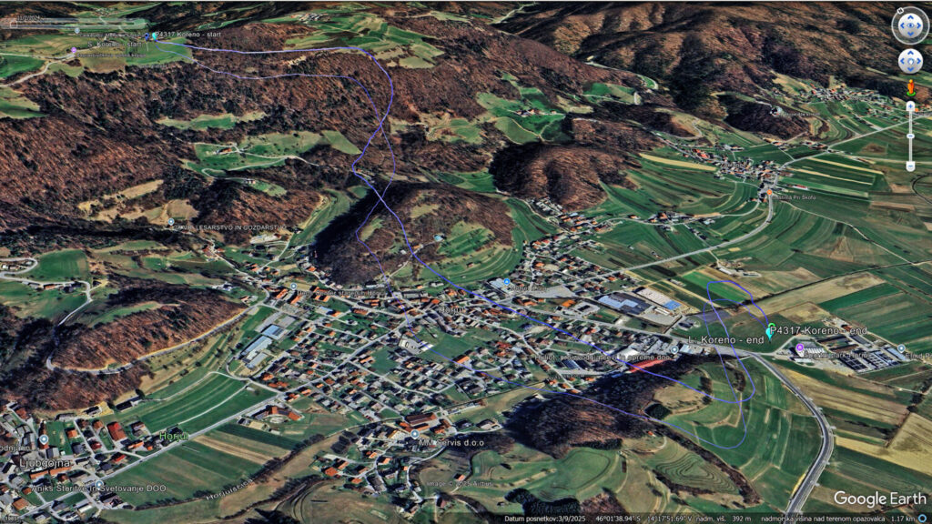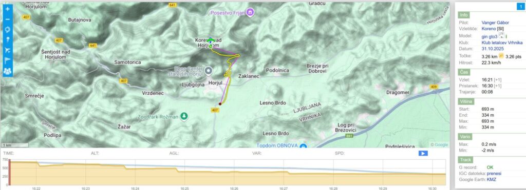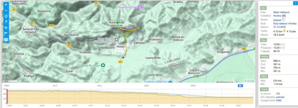 Potegnem in od prve speljem. V loku na levo kar drži okoli roba ob pobočju, tako da ostanem kar visoko, tik pod travniki Slevice. Potem pa nazaj nad Horjul še naprej nad vrtec proti Ljubgojni in ven nad grički Čelca v sprednjo dolino ter nazaj do ŠPH.