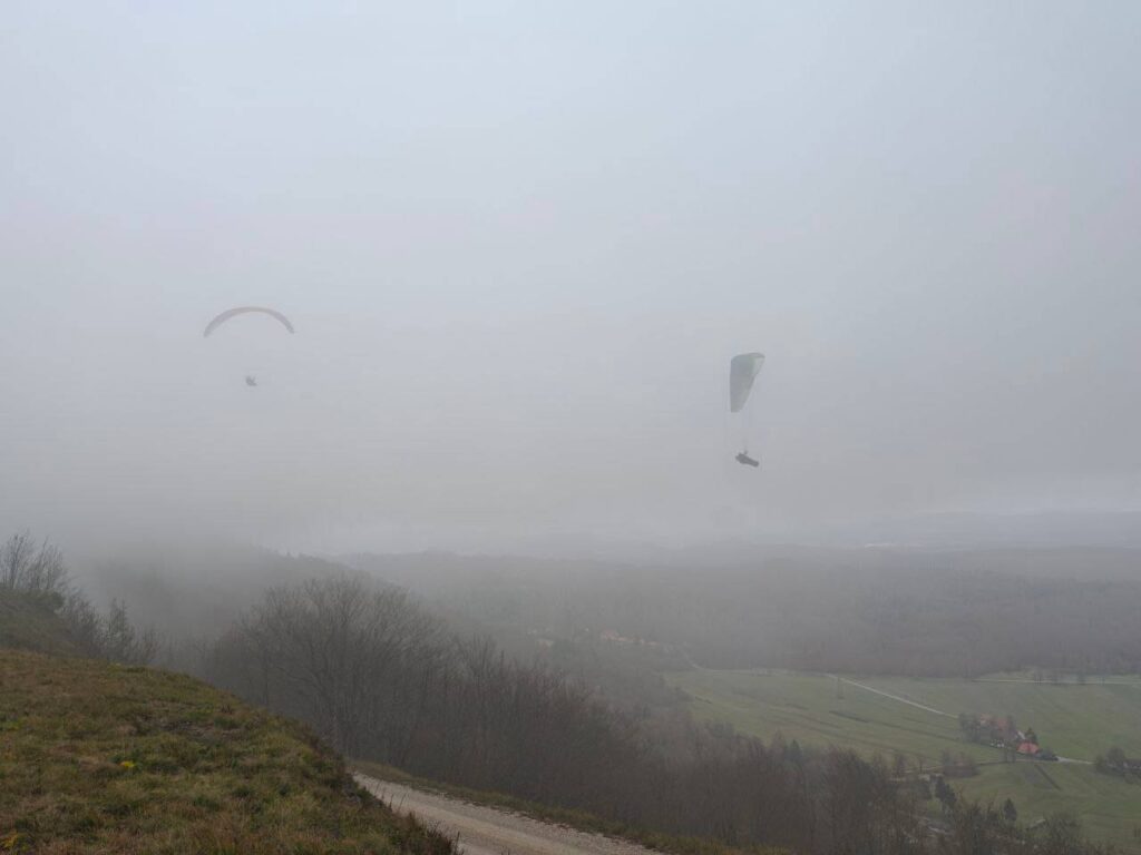 Ko prideva na start, pa je štart že v megli, dosedanje rahlo pršenje pa postopoma ponehuje. Nekaj časa modrujemo, Milanče groundhandla in moči svojo zgonjeno Delto; Erzo in GSM spravita Erzov avto dol za logistiko in potem še čakamo naprej ob občasnem odkrivanju pogleda v dolino (megla=baza se začne prav nad robom sedla).