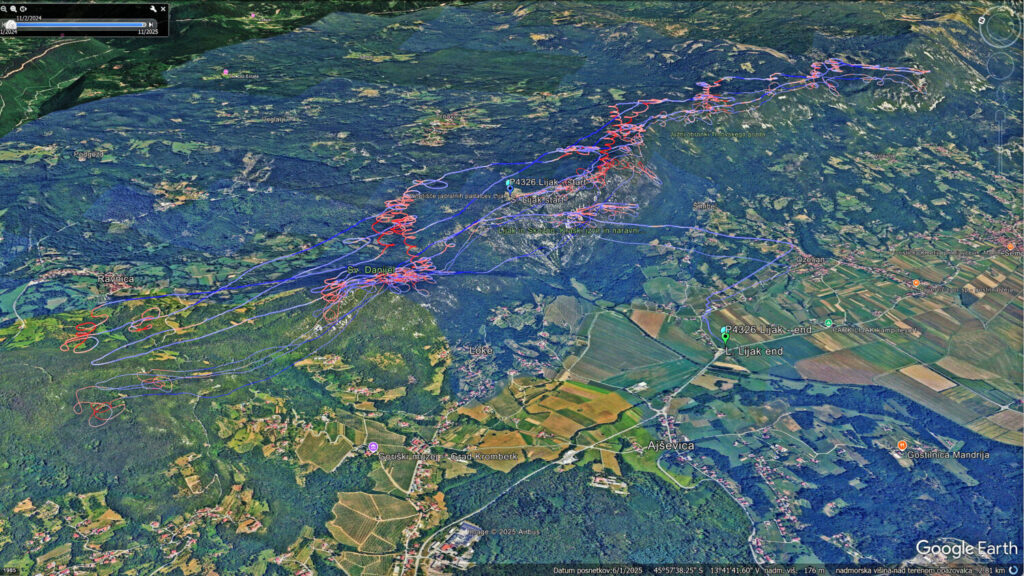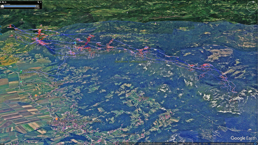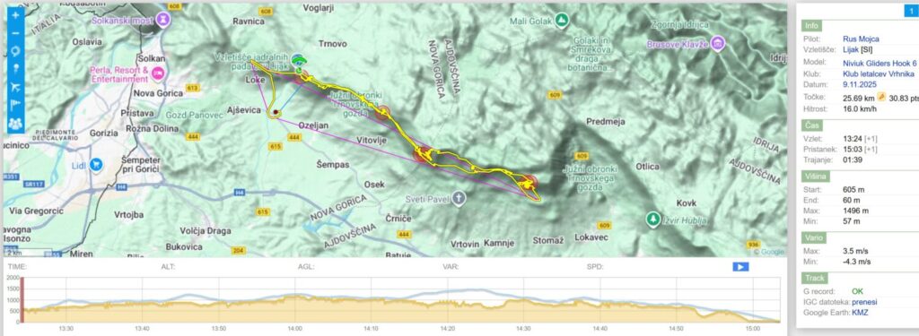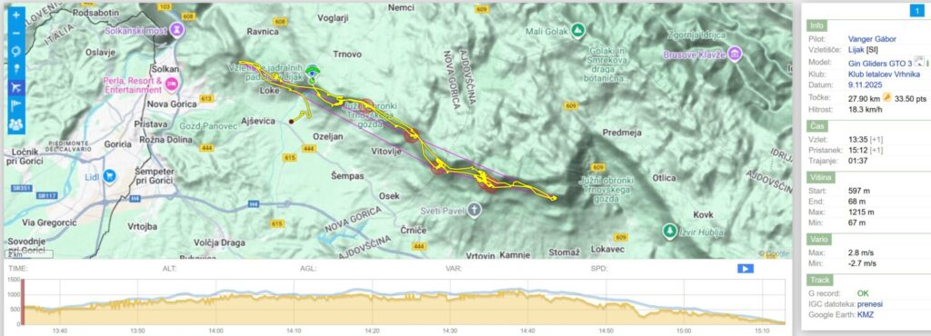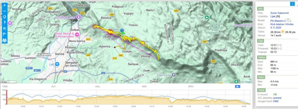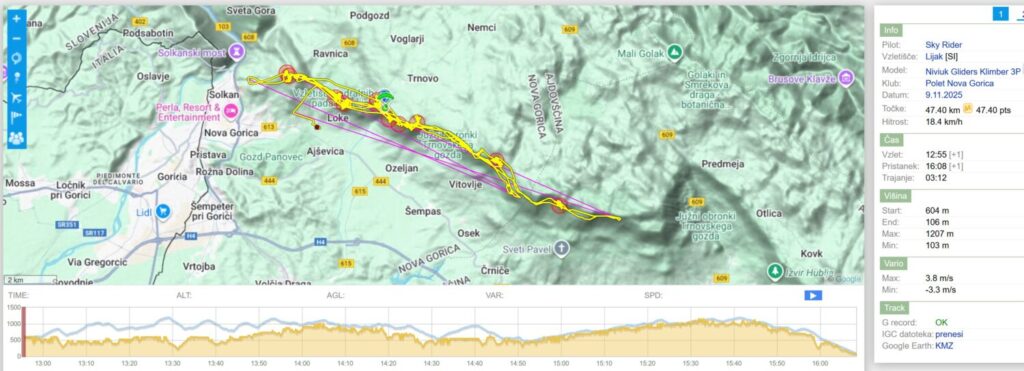 Nazaj do starta na 1000 in potem naprej proti Kasarni (vedno bolj razgonjeno, ko izgubljam višino, ob grebenu pa me kar ven odnaša). Močna dviganja in zgubljanja do Zmajarske, v kotlu proti Čavnu spet sunkovita dviganja in čeprav so nekateri visoko nad Čavnom, mene (ki sem v višini Skreta okoli 1000) ne mika naprej in raje obrnem nazaj.