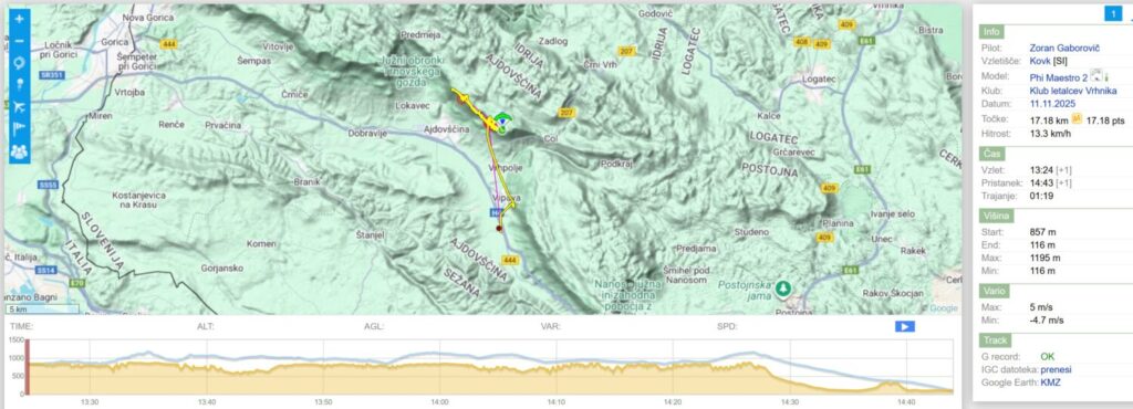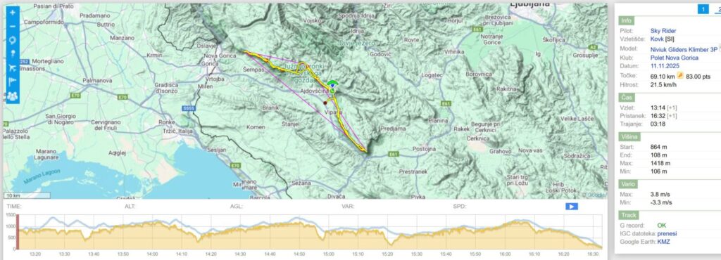 Komentar leta: V Mačjem kotu akro vlozek. Je zaprlo vec kot pol padala. Prvic v 200 urah, kar ga letim. Soncni zahod pred pristankom. [11.11.2025 19:12] Nikolina Plese : 🐲 [11.11.2025 19:08] Frenk Lokovšek : Super, da se je vse dobro izšlo …….. . [11.11.2025 19:49]