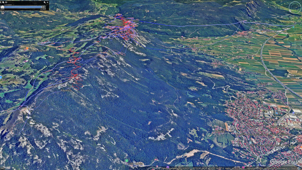 Pred startom močna dviganja, ampak vseeno rinem na Podrto, kjer pričakujem lepši steber… pa se mi udre in zacurim ko kanta… Vrnem se nazaj pred start in poberem nad greben. Vidim, da se Tomaž še bolj zunaj pobira iz nižav. Kmalu je višji kot jaz, zato se še sam zapeljem tja in nabiram do 1200 (tu zunaj je dosti bolj umirjeno). On se odpelje daleč stran od grebena proti Hublju, jaz pa malo bliže. Tomaž kmalu izgubi svojo lepo višino, jaz pa po grebenu izgubljam in spet pobiram.
