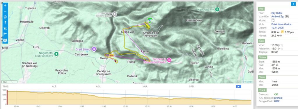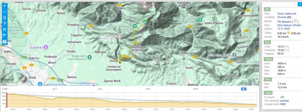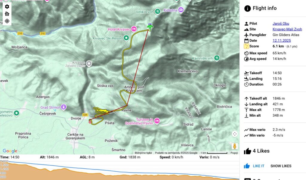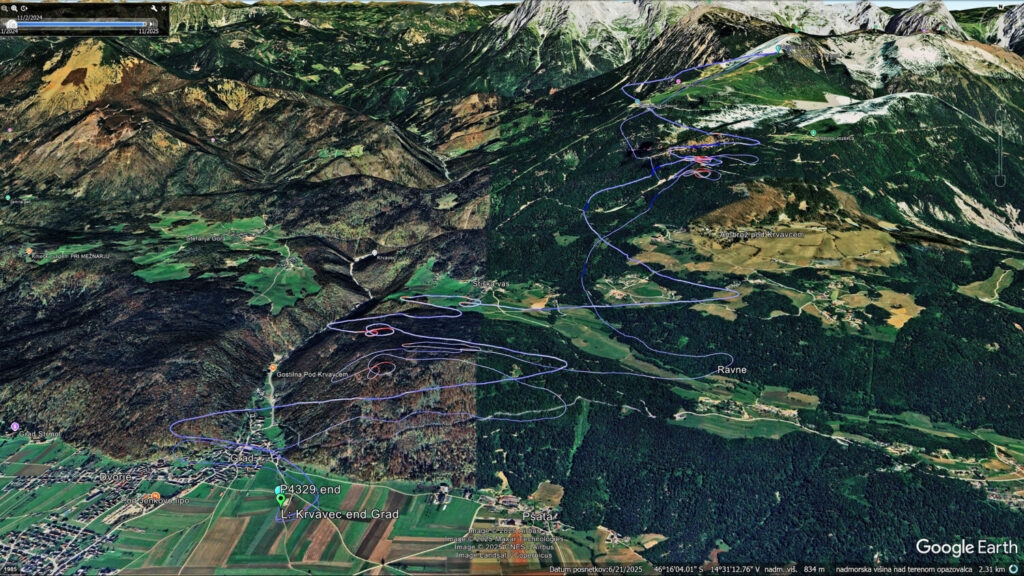 Jaroš izkoristi eno tako brezveterje s tendenco na gor in odleti. Nekaj za njim še jaz potegnem in po nekaj laufanja (?!) speljem… in sem v luftu. Jaroš se pelje samo ven stran od Krvavca mimo Ambroža in se potaplja v inverzijo proti Grajcu.