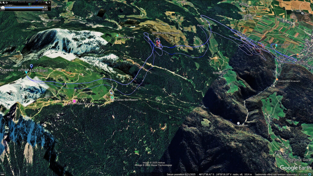 Preložita robo v LCja in gor: najprej do Ambrožarja, kjer piha lepo nežno gor – super za odleteti. Naslednji postanek je pri Hotelu, kjer čutimo šibek Z – lepo za odleteti. Ampak jaz bi šel še više. In potegnem gor mimo oddajnika na sam vrh Krvavca. Delux se že med vožnjo prostovoljno odloči, da bo v korist poenostavljene logistike spustil LCja dol do Zg.Poseke, ko midva odletiva in bo sam odletel od tam.