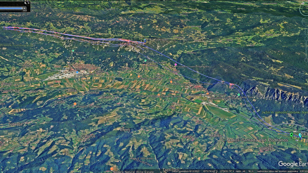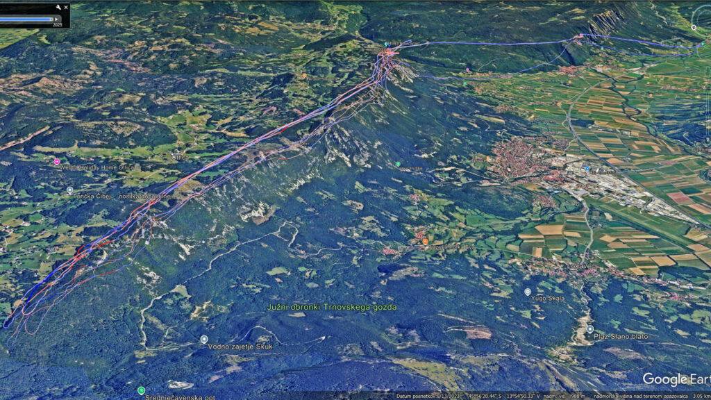 Ko pridem nazaj do starta, pa za Mojco samo čez Vipavo (jaz precej bolj ven kot ona), da se potem naslonim na pobočje za Plazom, medtem ko Mojca vsa nizka odstopi in zapelje proti Fami.
