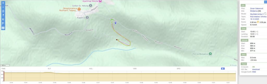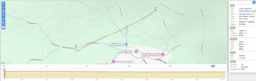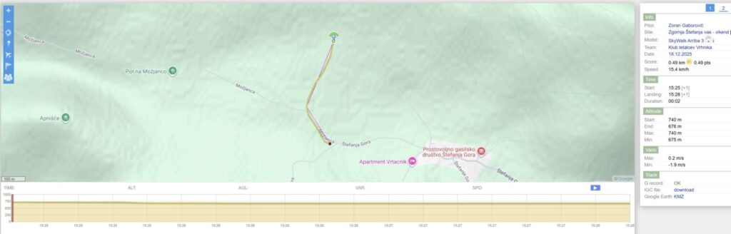 Sonce že zahaja, a zadnji žarki še sijejo po pobočju tu zgoraj. Šibek vetrič rahlo po pobočju gor. Hitro sem naštiman in še tretjič potegnem hrbtno. Po obratu me še pred teraso vzame in letim v ravni črti v senco. Spet me proti koncu drži tik nad tlemi še precej dlje, kot sem pričakoval in čez zadnjo travnato glavo preletim spet zgolj z rahlim potegom komand (zafleram čez 😁).