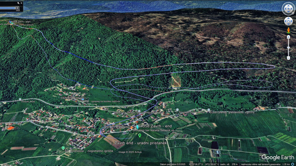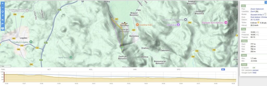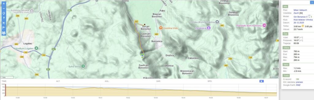 Kar drži in celo rahlo dviguje. Peljem samo ven, saj se bojim, da veter jača in me bo na robu na Trebelniku ustavil. Pa me kar drži in pred Trebelnikom sem celo nekaj nad vrhom. Levo naprej pa so na pobočju megle/baza dokaj pod robom, zato nadaljujem naprej ven nad dolino… in še vedno drži. Ko sem že skoraj nad Škorpijonom, pa zavijem nazaj na pobočje z mislijo, da po tam še bolje držalo. Sprva res drži, potem pa začnem zgubljati višino. Vseeno peljem do kotanje pred Bistro, kjer obrnem.