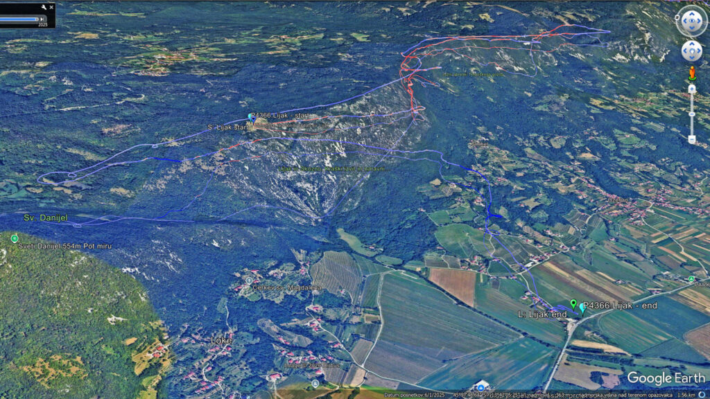 Pri Kasarni srečam Mojco, ki se je očitno rešila iz nemogočih nižin… Brez pobiranja sem hitro nad Lijakom in se bolj zunaj odpeljem naprej na Danijela. Sicer le počasi zgubljam višino do Danijela (900->700), vendar tu ni obenega dviganja in samo še bolj tonem. Zato obrnem nazaj v veter in v močnem kontra vetru zelo počasi v curaži pririnem pod Lijak (ravno startuje drugič Jaroš, Milče je že v zraku malo pred njim…). Poskušam naprej do vogala, pa me samo tlači dol (tudi samo 15 naprej), dokler nisem tako nizek, da obrnem ven in se odpeljem na pristanek, kjer že čaka Meta z LCjem.