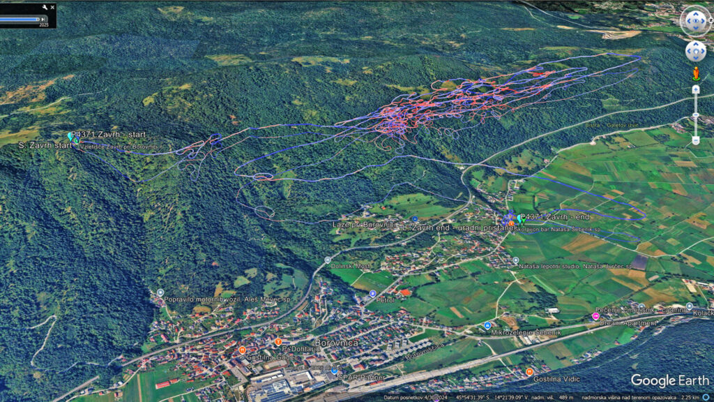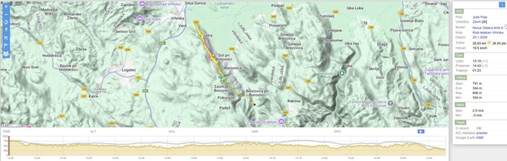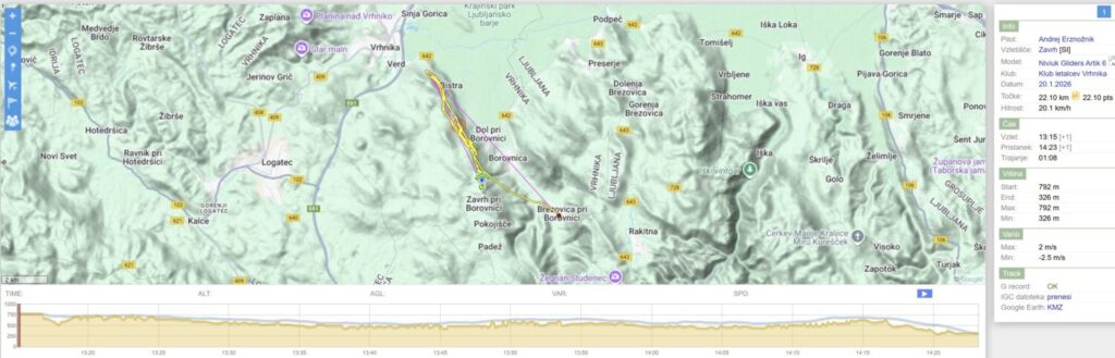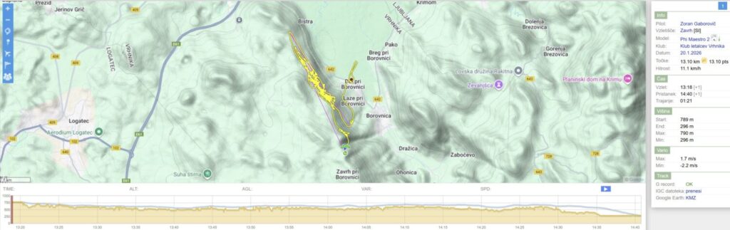 Erzo in Poje z lepšo višino nadaljujeta proti Javorču, jaz nižji tudi, pa obrnem že pred Bistro. Spet nekaj skupinskega jadranja okoli kotla nad Dolom, izogibajoč se drug drugemu. Ko se mi napolni 1h potegnem še enkrat (skoraj) do Javorča, nazaj s podaljškom pod Trebelnik in daleč ven nad Barje (v kontra vetru sicer počasi, ampak lepo drži) in nazaj na pristanek.