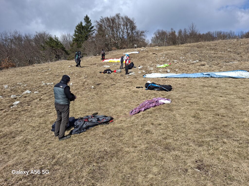 Ob 12h se na Vrhniki naložimo k Pojetu (ki se je srečno vrnil iz daljnjih zamorskih dežel) Delux, Erzo in jaz in v Ceknico in gor na start, kjer že nekaj časa čakata Emil in Nevidni. Ravno ko pridemo, se baje pokritost malo odpre in nekaj sončka takoj pojača veter (5-6/7-8 JZ).