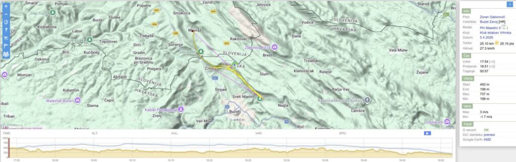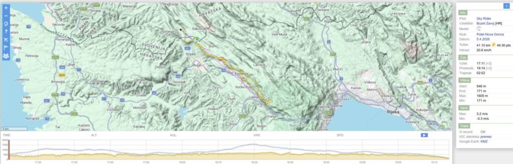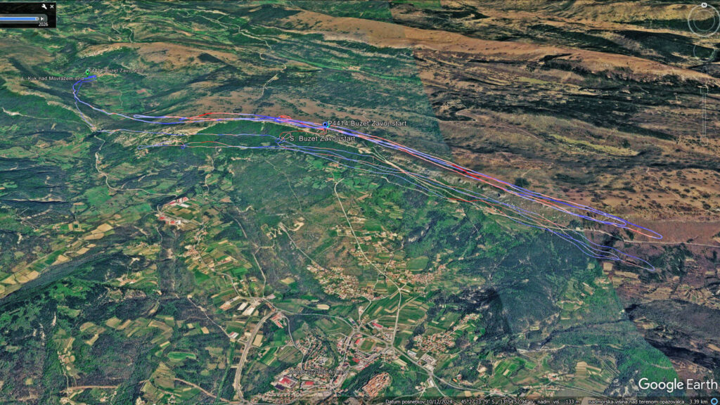 Končno v pozi za kobro napeto čaka, da bi sunki malo popustili in okoli 15.30, po 1/2 uri čakanja odločno potegne… in ga na mestu dvigne s tal in zelo atraktivno odleti. Takoj ga odlifta v višave in komaj leze naprej, občasno pa je videti, da ga kar zaziba sem in tja (ravno takrat postaja pokaže današnji max 10.5/14.0 !!). Emiliano in kompanjon začneta pospravljati za taktični premik na drugo lokacijo (Kaštelir, Motovun). Mi 3je poležujemo in se sončimo še naprej.