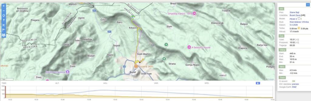 Še med vožnjo na Vrhniko gledam postaje in jasno je, da Slivnica odpade (sunki že proti 12…). Tudi poročilo s Strmce pravi, da je tam premočno. Na Vrhniki pričakam le Nikolino, Deluxa in Sparkyja (nekateri že odpovedo, nekateri kasneje na Lijak…). Vržem kost, da je na Buzetu baje OK (info neposredno s starta) in ker Vrermščica pokaže sunek 17.8, je tudi Delux za smer Buzet, saj ga Socerb (na katerem ravnokar jadrajo) ne zanima, ker baje smrad po nafti negativno vpliva na njegove nosne brbončice…