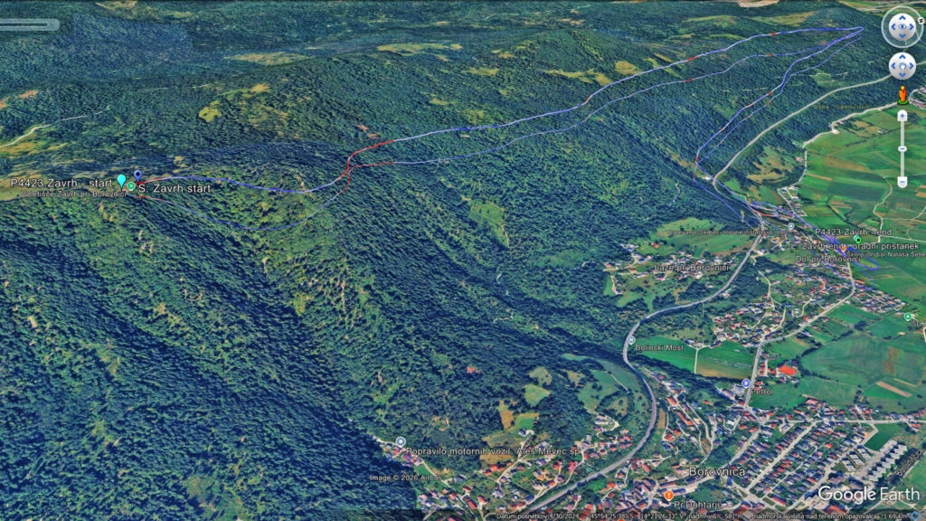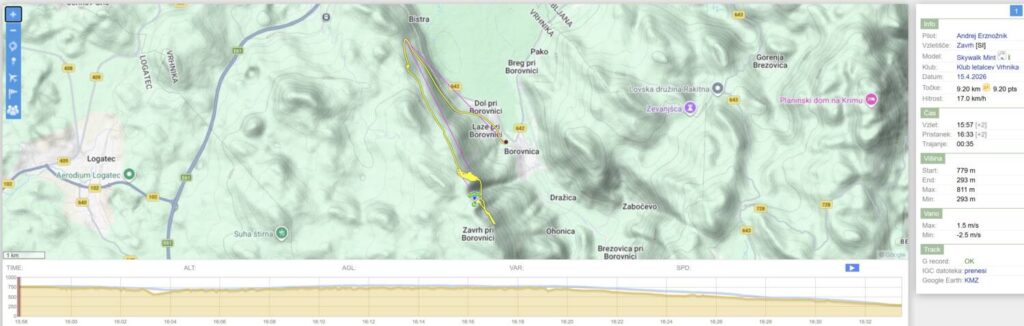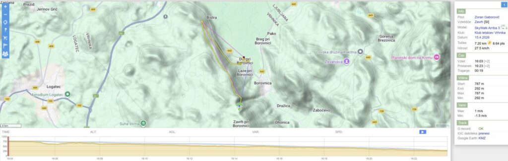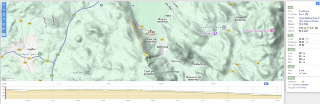 On še kar drajsa, jaz pa samo naprej, saj me lepo drži. Nad Dol pridem visoko, kot že dolgo ne in samo peljem naprej do Javorča. Ko pridem okoli roba nad Bistro, mislim, da me bo kaj dvignilo, pa ni nič. Nazaj pa mi gre v rahli curaži dosti počasneje, vendar vseeno pridem še mimo pristanka z višino, da lahko lepo zajadram nazaj na pristanek.