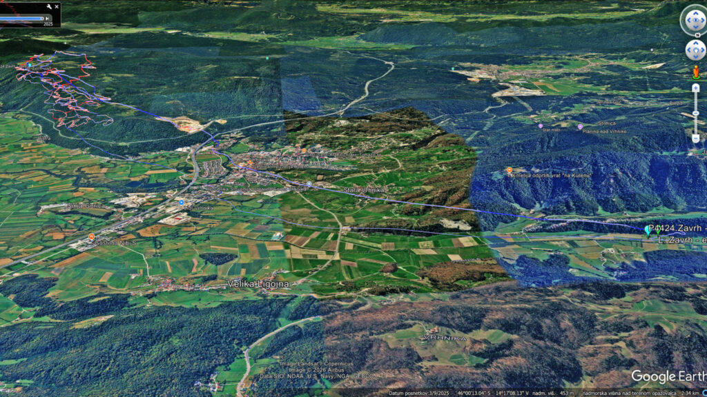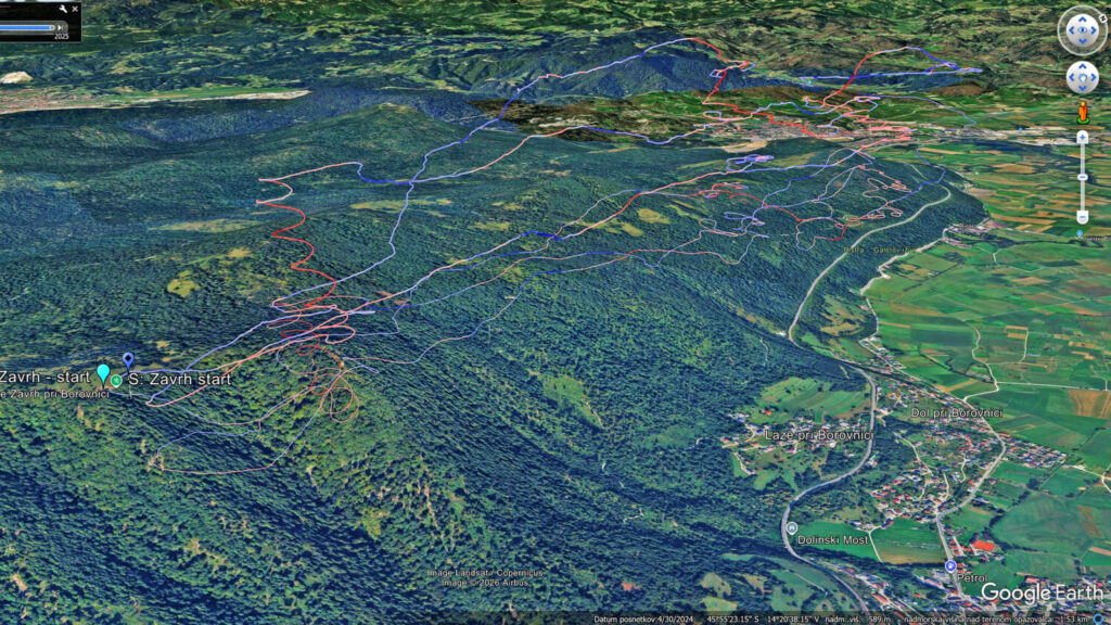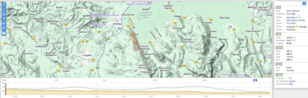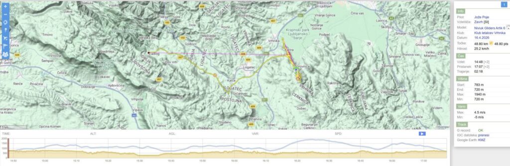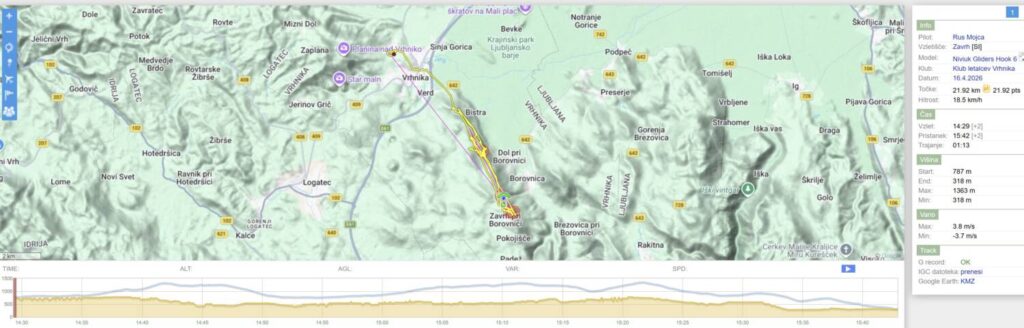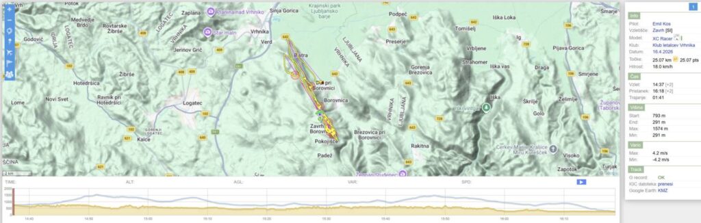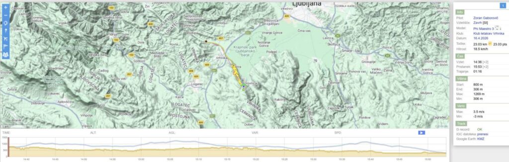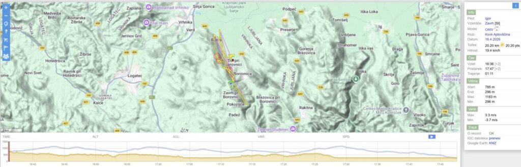 Drugo rundo nazaj sem dosti nižji, predvsem pa je vse, tu nižje, pošteno razgonjeno in padalo občasno nosi kar po svoje… Spet obrnem na Javorču in rinem nazaj v veter tudi samo 15, da se pred Dolom odločim, da neham riniti naprej proti pristanku, ampak obrnem spet proti Javorču, pred njim naberem do 1200 in se odpeljem čez AC in Vrhniko (kjer me spet dvigne brez pobiranja) s 50+ dokaj razbutano do vstopa v Podlipsko. Tu pa v bolj mirnem in še vedno močnem vetru s 60+ v Podlipsko, v hvaležnosti, da me počasi in sigurno spušča.