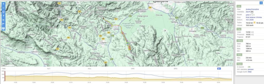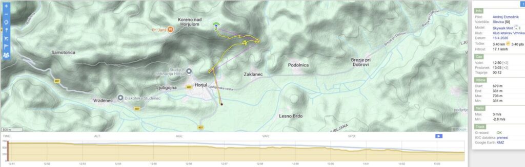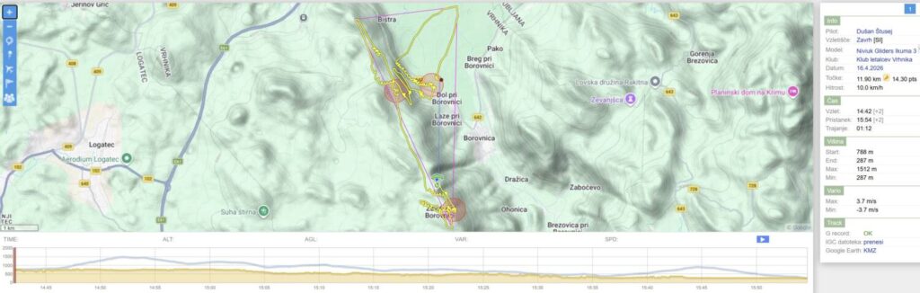 Na Trebelniku naberem na 1100 in v dviganjih in spuščanjih visoko do Javorča in nad njim obrat in z nabiranjem nazaj. Pred Dolom imam skoraj 1300, pa v močni borbi proti vetru scurim malo pod štart (vidim, da na štartu kar močno piha), tako da ne rinem več naprej proti Anteni.