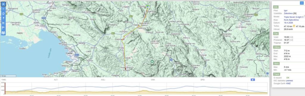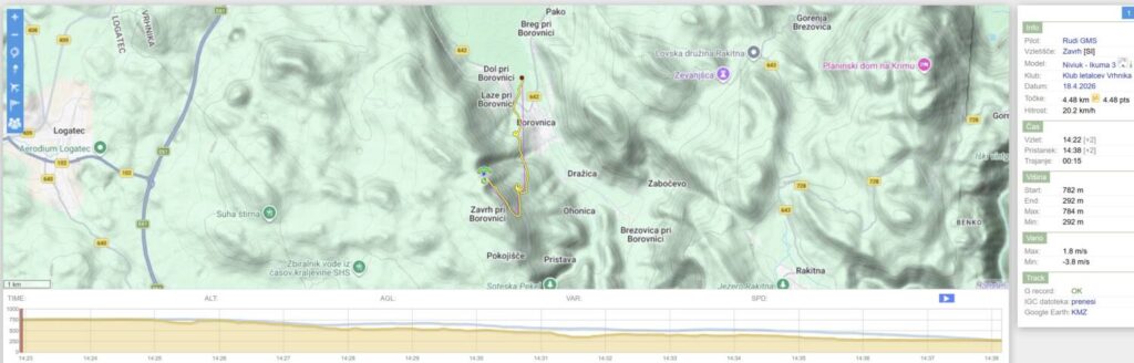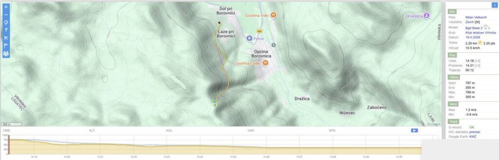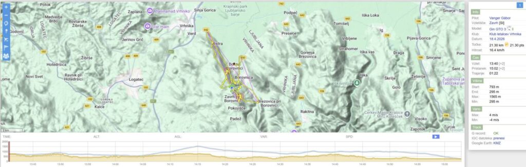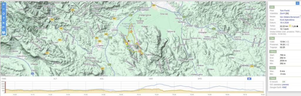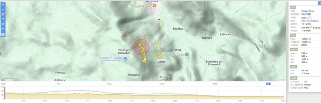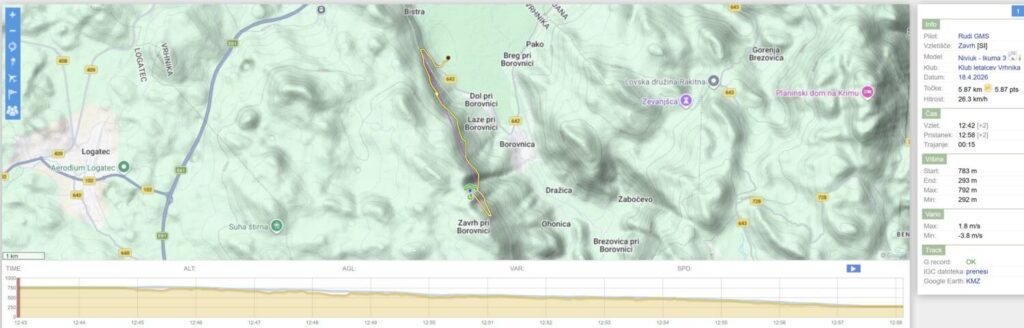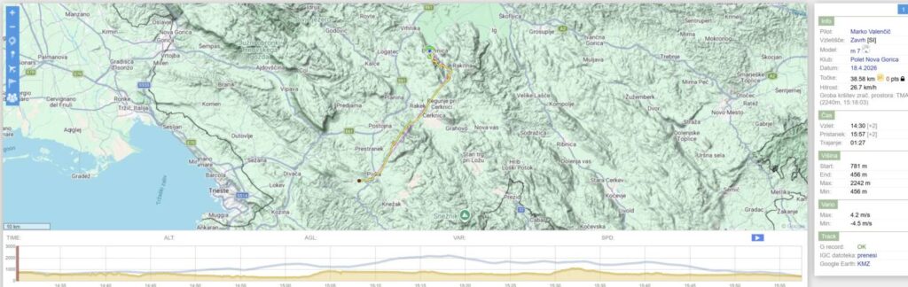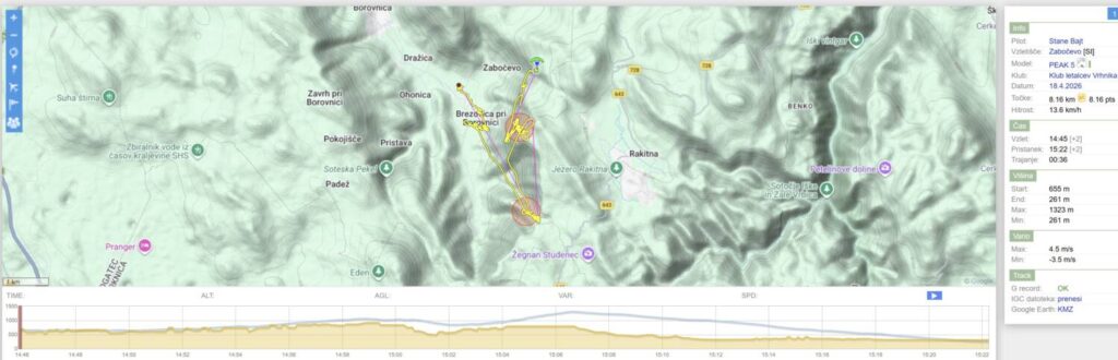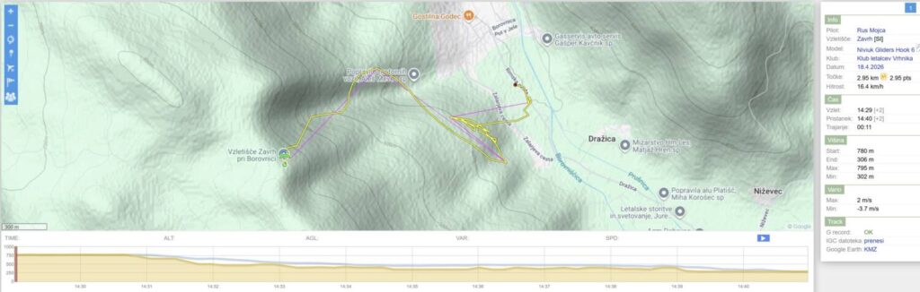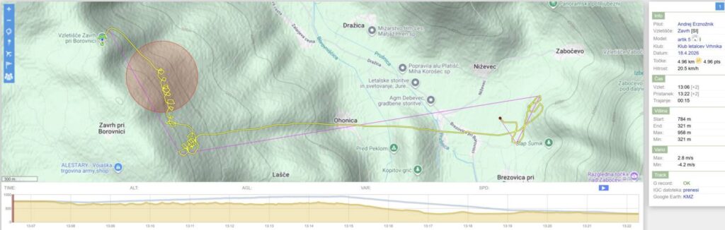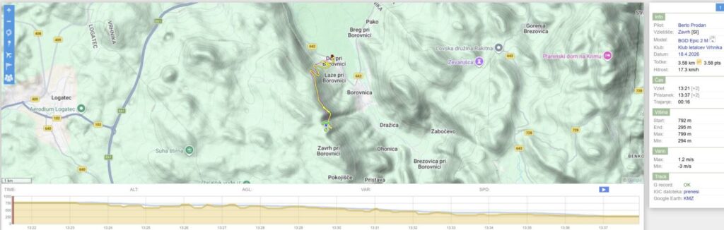 Tom Pavlič : Kot prvo vse najboljše Zoki! … Da ne pozabim Kakšen dan. Sonde prvo curijo, mi pa opazujemo. Ko določimo, da je pravi cajt, začne pihati dol. Super. No, nekako štartam in začne matranje… Šele po slabi uri naberem nad greben. Uf. Poskusim še malo proti štartu, pa ne dela. Vidim da nekaj nabirajo zunaj, pa poskusim še jaz. Nekaj pisketa, pol me pa požere. Pristajam. Sicer pridem na vznožje hriba, ampak na višini zadnjih krošenj. Nakar rekordni low save. Ne vem koliko sem bil nad tlemi, ampak tako nizko se še nisem rešil. Naberem na 2k, ampak nad 1500 je bilo treba že fajn lovit padalo. Ker sem hotel ostati v tem peskovniku, grem malo proti vetru. A melje kot pr norcih. Šele daleč nad dolino se mi pulz spet malo umiri. Na koncu pa itak ni hotelo dol. Uh. Po 12h letih spet na Zavrhu, in vesel kot radio [18.4.2026 16:36]