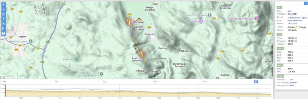 Igor : H&F. Prvi današnji. Za slabe pogoje na Zavrhu mora biti izpolnjen vsaj eden od spodaj naštetih pogojev. Če sa po vsi trije hkrati, se na Zavrh ne hodi 🤣🤣🤣: 1.Napovedana dobra termika z le 2-3 m/s SV. 2.Pojavi se en kup pilotov ker “danes bo ta dan”. 3.Dan prej se odlično leti na Zavrhu. Hvala Aleš padalec z BMW., za dostavo od Viadukta do Škorpiona. [18.4.2026 19:09]