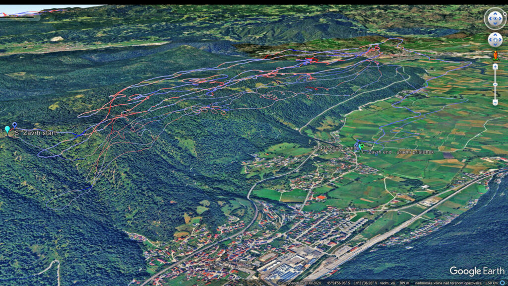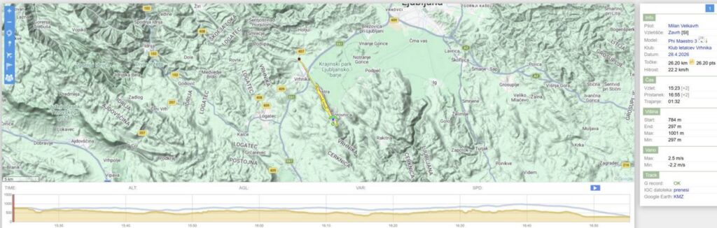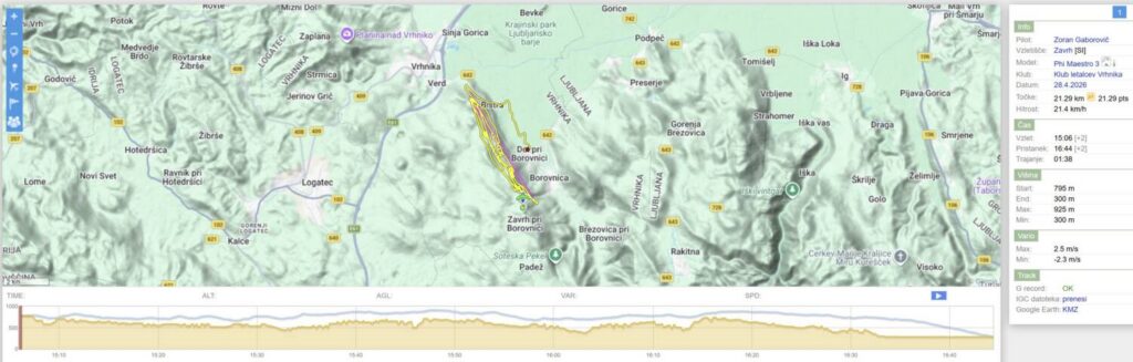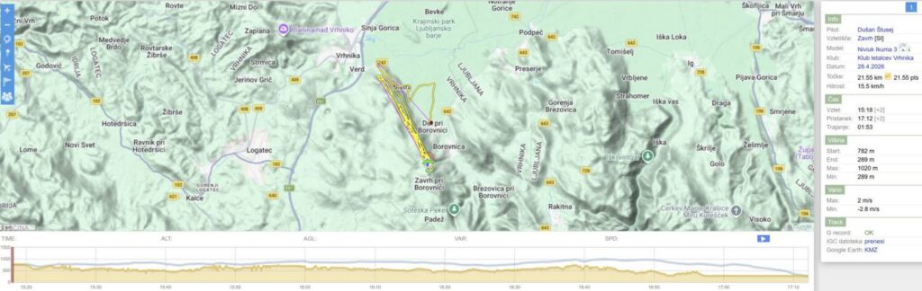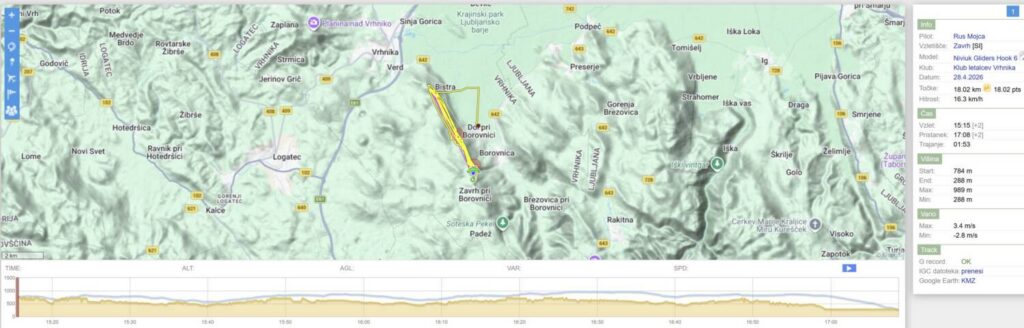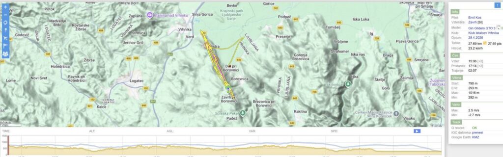 Čakamo in čakamo, sunki pa ves čas 8-10. Nekaj po 15h se prepričamo, da se veter umirja… (še vedno 8-10, le vmesni presledki se baje daljšajo…). Postavimo in v zrak Emil, takoj za njim jaz in ostali. Visoko zapeljeva z Emilom okoli Trebelnika in po nekaj rukanja nabereva nad greben in naprej. Emil bolj zunaj, jaz bolj po grebenu. Peljem za Emilom do Javorča, kjer nabereva. Emil potegne še malo ven in naprej proti Vrhniki, jaz obrnem nazaj. Lin po n urah letenja ravno pristaja na uradnem…