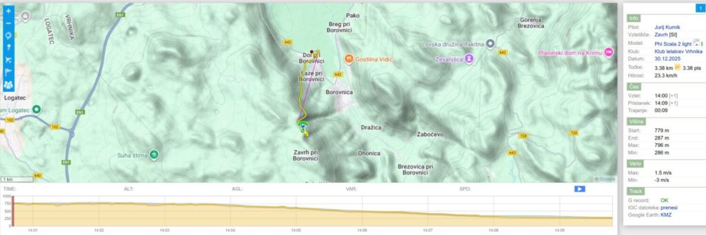 Ko pripešačiva na start, nama čakajoči Uki poroča, da je Jurij sicer lepo startal, sprva celo malo pobral, potem pa za Trebelnikom samo zacuril na pristanek. Delux se začne pripravljati, mene pa sploh ne vleče več, saj Ančka medtem naraste na 15,7 ! Ko Jurij sporoči, da je na pristanku kar “živahno” in močni mešajoči sunki vetra (8-10) in da je njega za Trebelnikom SZ veter praktično ustavil in je samo še prilezel do pristanka, me želja po letenju že (skoraj) mine.