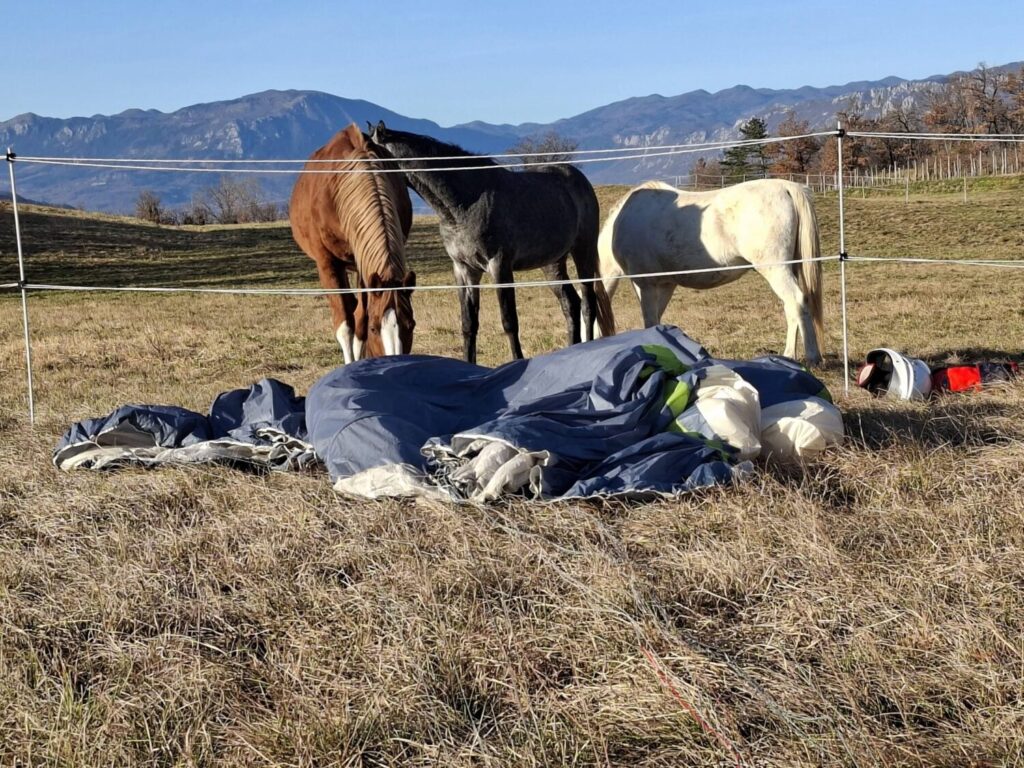V zraku me sprva podrži in celo rahlo dvigne, da sem v trenutku v mleku in že zavijem preveč v levo (očitno avtomatsko, saj nočem v desno, kamor me vleče moja desnoročnost – sem že nekoč rekel, da se v meglo ne bom več metal !!) pa že levo zagledam/zaslutim pobočje prav blizu in zategnem bolj v desno… in sem v prosojni megli nad dolino. Peljem proti Vipavi in nazaj na uradni.