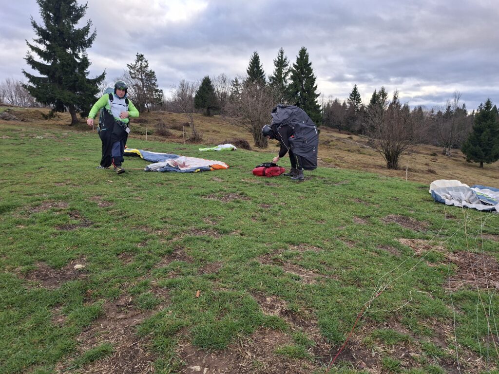 Erzo mi pride pomagati pospraviti padalo, ko se pripeljeta na uradni pristanek (vidi, da nisem čisto pri sebi). Mojca je že nekaj časa na tleh, kot tudi Berto.