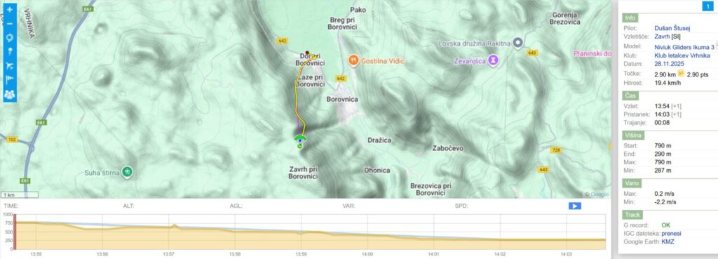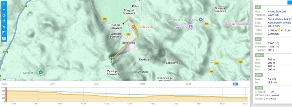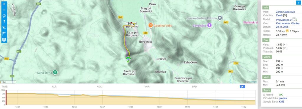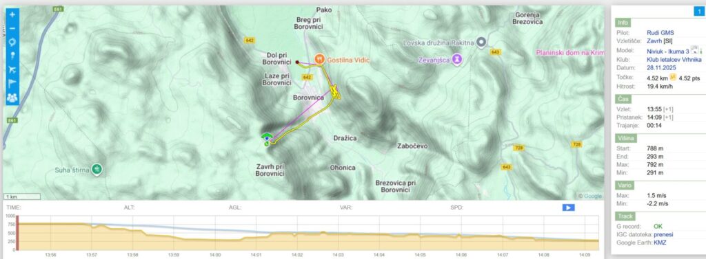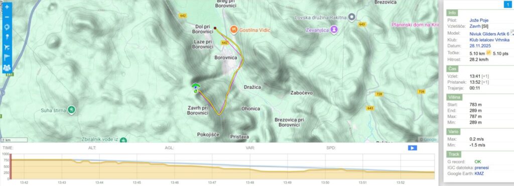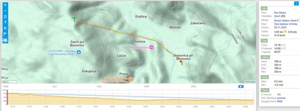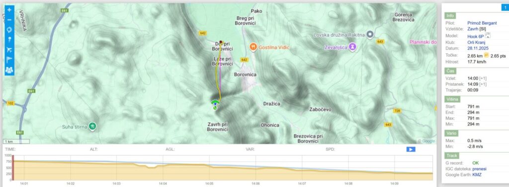 Dragan Vidic : Ob šibki burji kar dobre razmere, termika na trenutke kar zmerna. Škabrijel me prvič ni spustil naprej, drugič pa je bilo že prepozno. Malo me je sicer zeblo, vendar sem zelo užival v letenju! [19.11.2025 19:05]