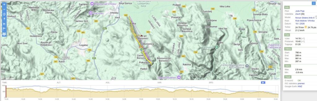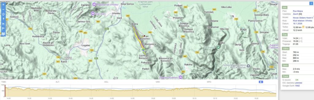V dviganju (in občasnih guncajočih sunkih) le počasi lezem ven iz kotla. Ko sem že precej pred Trebelnikom, se usmerim bolj v levo in z lepo višino daleč pred pobočjem v vzdrževanju višine brez pobiranj peljem do Javorča kjer obrnem. Nazaj sprva v močnejšem zgubljanju višine peljem v veter, pa ob pobočju hitro spet začnem lesti gor.