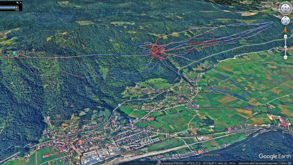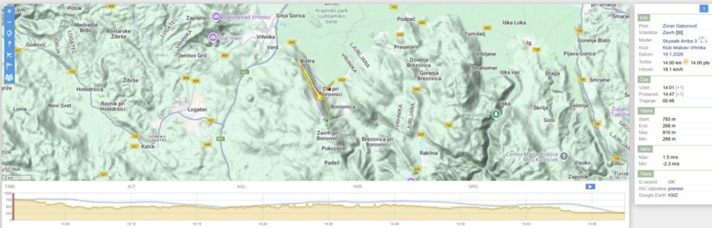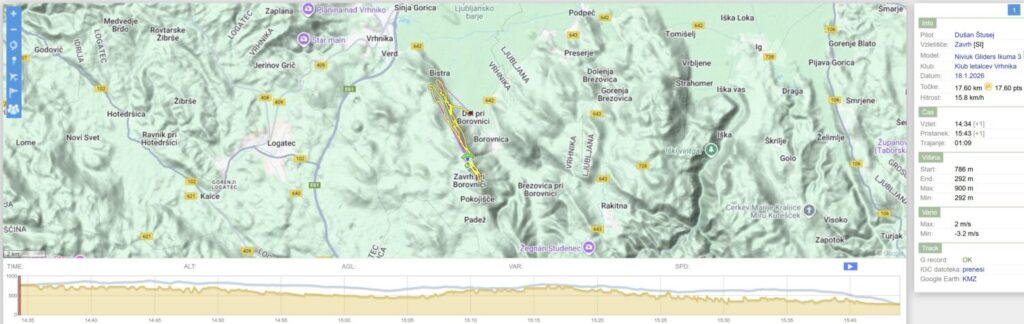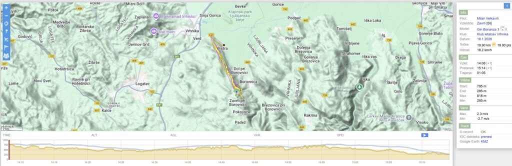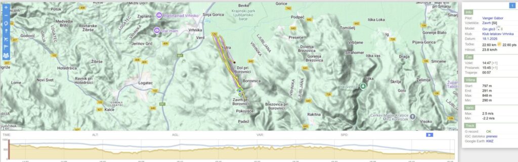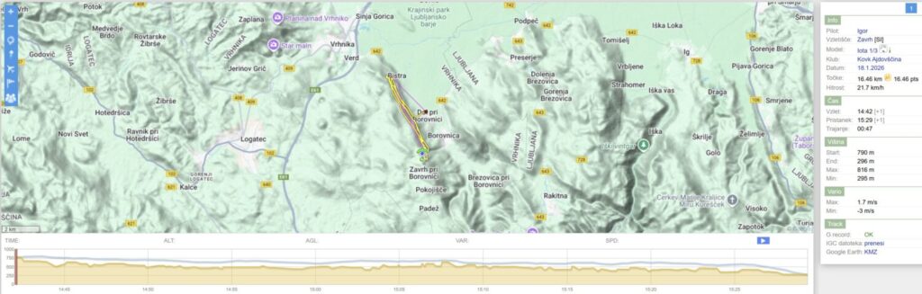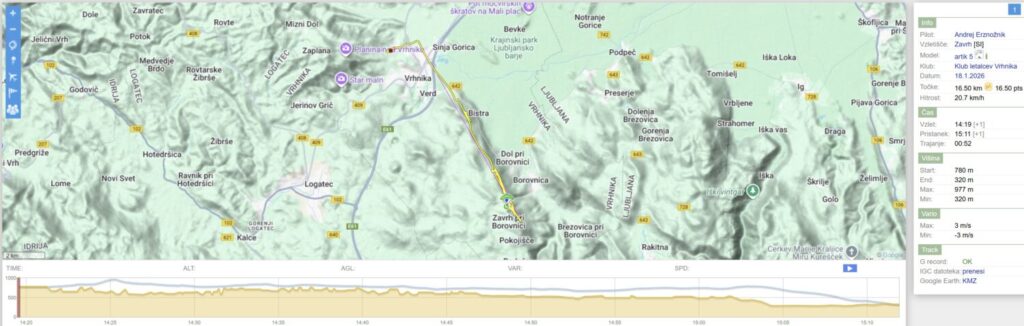 Nad Dolom malo nabiram, ko pa hočem nadaljevati proti startu/Trebelniku, mi dviganj zmanjka in raje kar obrnem v 2.rundo do Javorča in nazaj. Ko sem spet nazaj nad Dolom (in sem že skoraj kos ledu v zraku) pa še malo naberem in se odpeljem nad Barje, dokler ne zgubim dovolj višine, da se samo še odpeljem nazaj na pristanek.