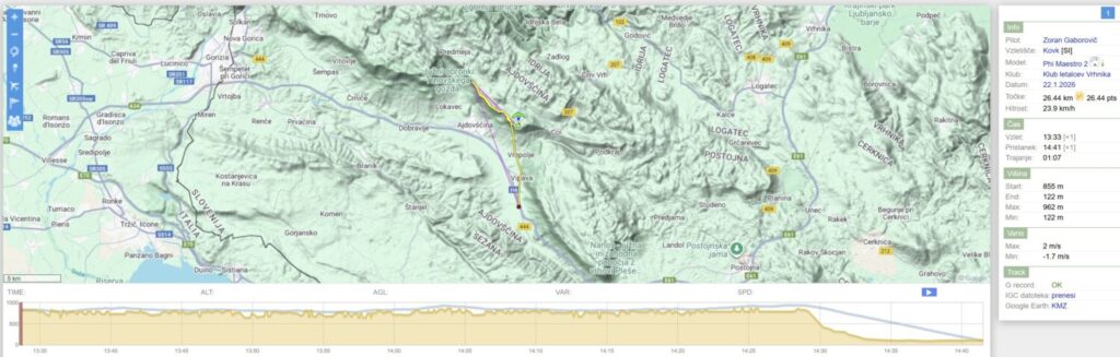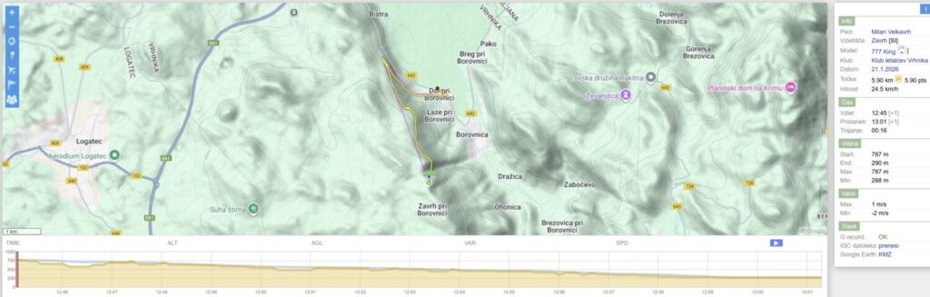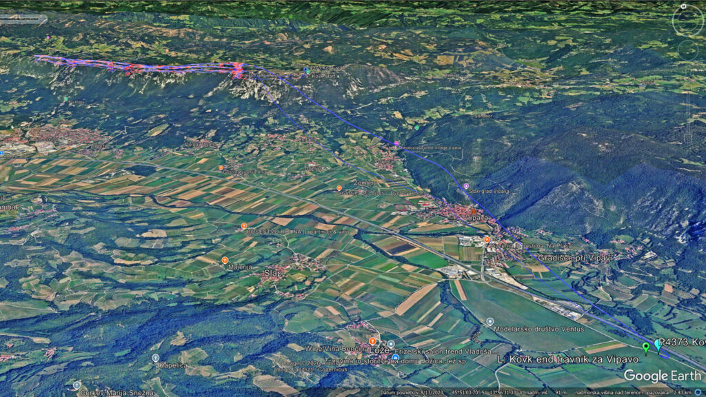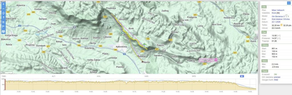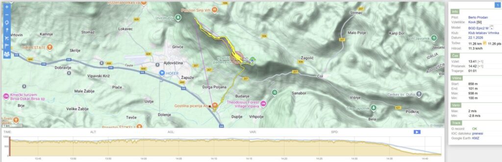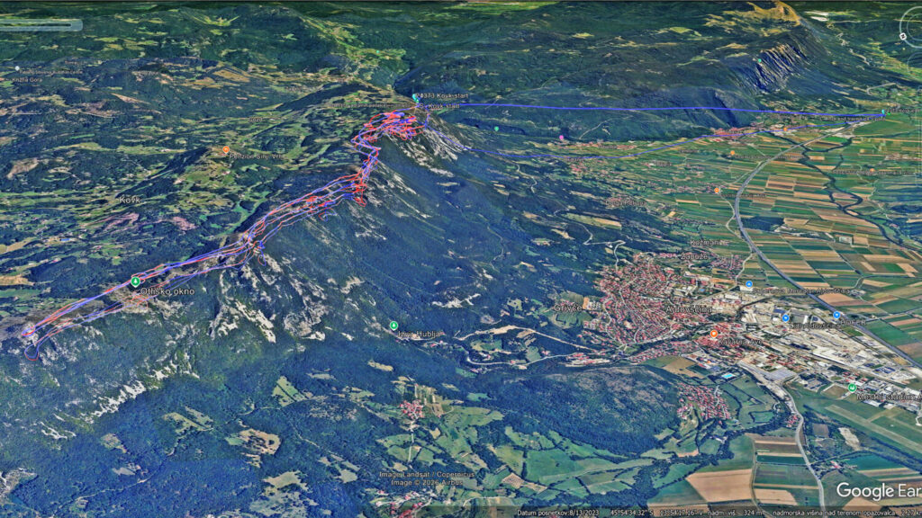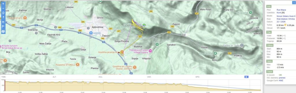 Nazaj z vmesnimi pobiranji uspem celo priti malo nad rob grebena in vse do Podrte. Tu spet raje naberem do roba in v drugo rundo, v kateri pa sem večinoma rahlo nad robom. Spet obrnem na Otliškem maju in podobno nazaj ob izkoriščjanju vskega šibkega dviganja do Podrte. Tu malo še drajsam ob/nad robom, dokler se ne začne približevati 1 polna ura, potem pa potegnem čez dolino nad Vipavo in naprej … dokler gre.