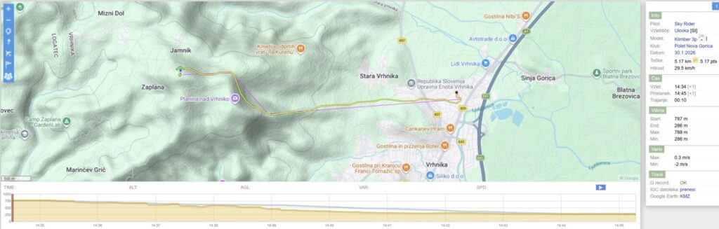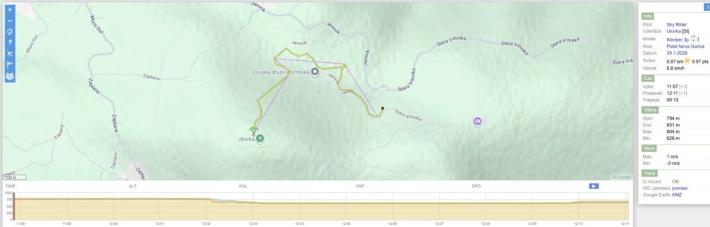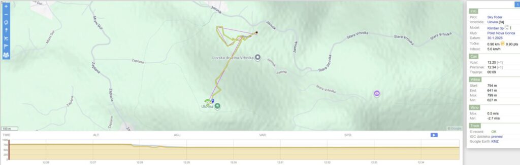 Nazaj kar dviguje, Mojca pobere bolj zunaj nad Dolom, jaz pa tam nekje dobim dviganje dneva, ki me skoraj po liftu dvigne za 200m. Veter je tu gori (na 900+) močnejši in naprej samo še vozim v vzdrževanju višine bolj zunaj do Javorča. Sedaj sem tu precej višji kot prvo rundo in nazaj zapeljem z bogato višino bolj nad dolino.