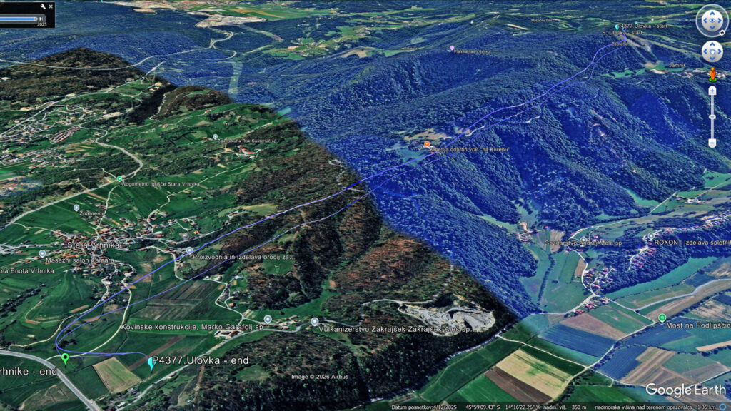Nad Dolom postane bolj dinamično, vendar potegnem rahlo guncajoče kar zunaj še mimo starta naprej. Obrnem in z veliko višino nad pristanek. Kar drži in je res čutiti veter, ki ugasne šele tik nad tlemi.