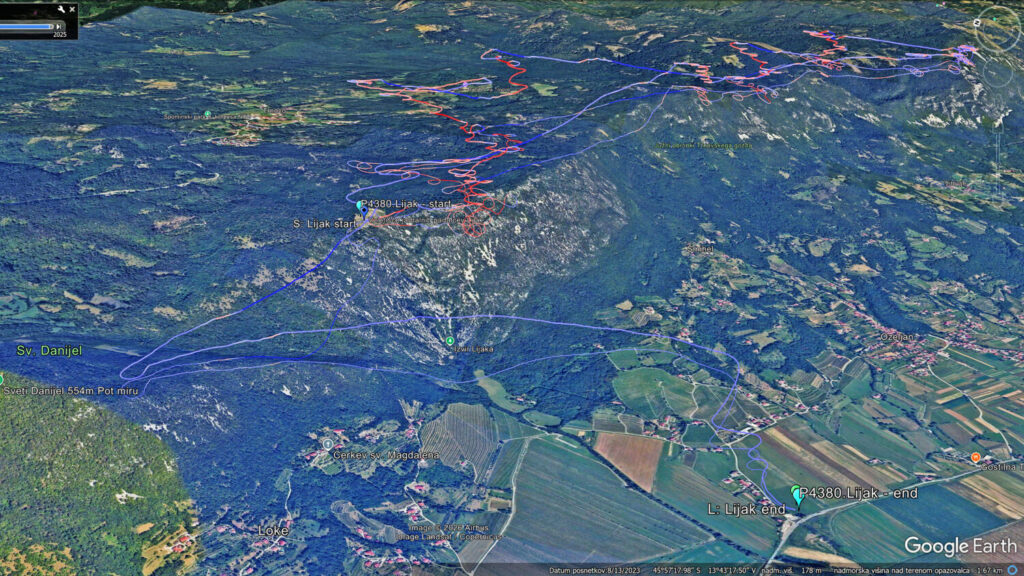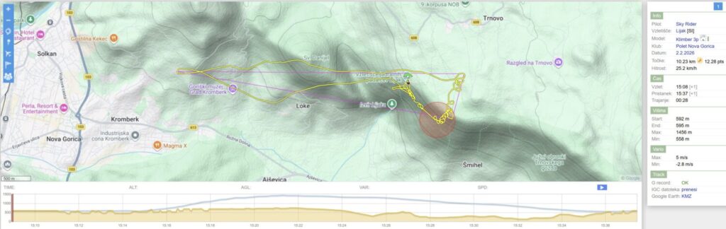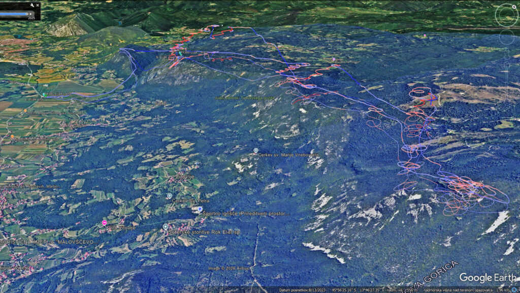 Mojca je že visoko nad grebenom v smeri proti Zmajarski, ko jaz še pobiram v ostrih (pomladanskih) dviganjih nad Lijakom. Želim si pobrati čim višje, da bom potem bolj brezskrbno nadaljeval proti Čavnu… Malo poskušam nabrati tudi na Z pobočju proti Danijelu, pa kaj dosti čez 1200 ne pridem in na koncu zapeljem proti Kasarni.