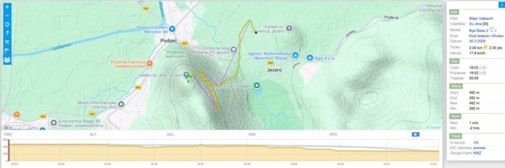 Startam drugi in me čez kotel lepo drži (zdaj je vse OK) do Trebelnika, kjer tudi sam začnem vrteti in nekaj naberem. Pridružita se Moca in Milanče. Delux odpelje čez dolino na Planinco in tam poskuša srečo. Jaz pa z lepo višini nad Dol in še naprej, pa prehitro obrnem nazaj pred Bistro (da bi v kotlu nad Dolom še dodatno pobral) in z nekaj borbe odcurim na pristanek, kjer tik pred mano pristane Mojca.